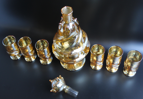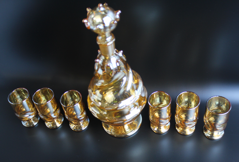 Комплект штоф и 6 стопок, дутое стекло, гутная техника, перламутр, СССР 1960-1990 гг. Высота штофа - 25 см, высота стопки - 7.5 см.