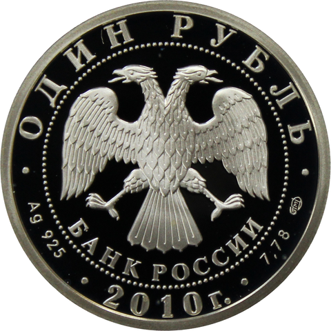 Аверс: Вверху вдоль канта номинал «ОДИН РУБЛЬ», внизу слева химическое название «Ag» и проба «925» металла, внизу по центру год выпуска «2010 г.», внизу справа чистый вес находящегося в монете драгоценного металла «7,78» и монограмма монетного двора «СПМД». В середине в ободке из точек двуглавый орел под ним с внутренней стороны точечного ободка слова «БАНК РОССИИ».