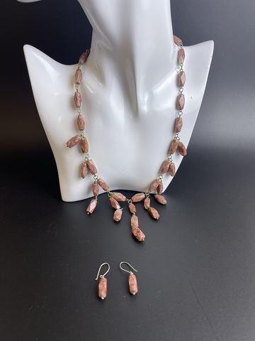 Комплект украшений бусы и сережки из натурального камня Родонит, винтажные, времен СССР 1970-1990 гг. Изящные бусы и сережки отлично подойдут как на подарок, так и в личную коллекцию украшений. Длина бус в расстегнутом виде - 46 см, в застегнутом - 22 см, сережки длина - 3 см. Состояние на фото