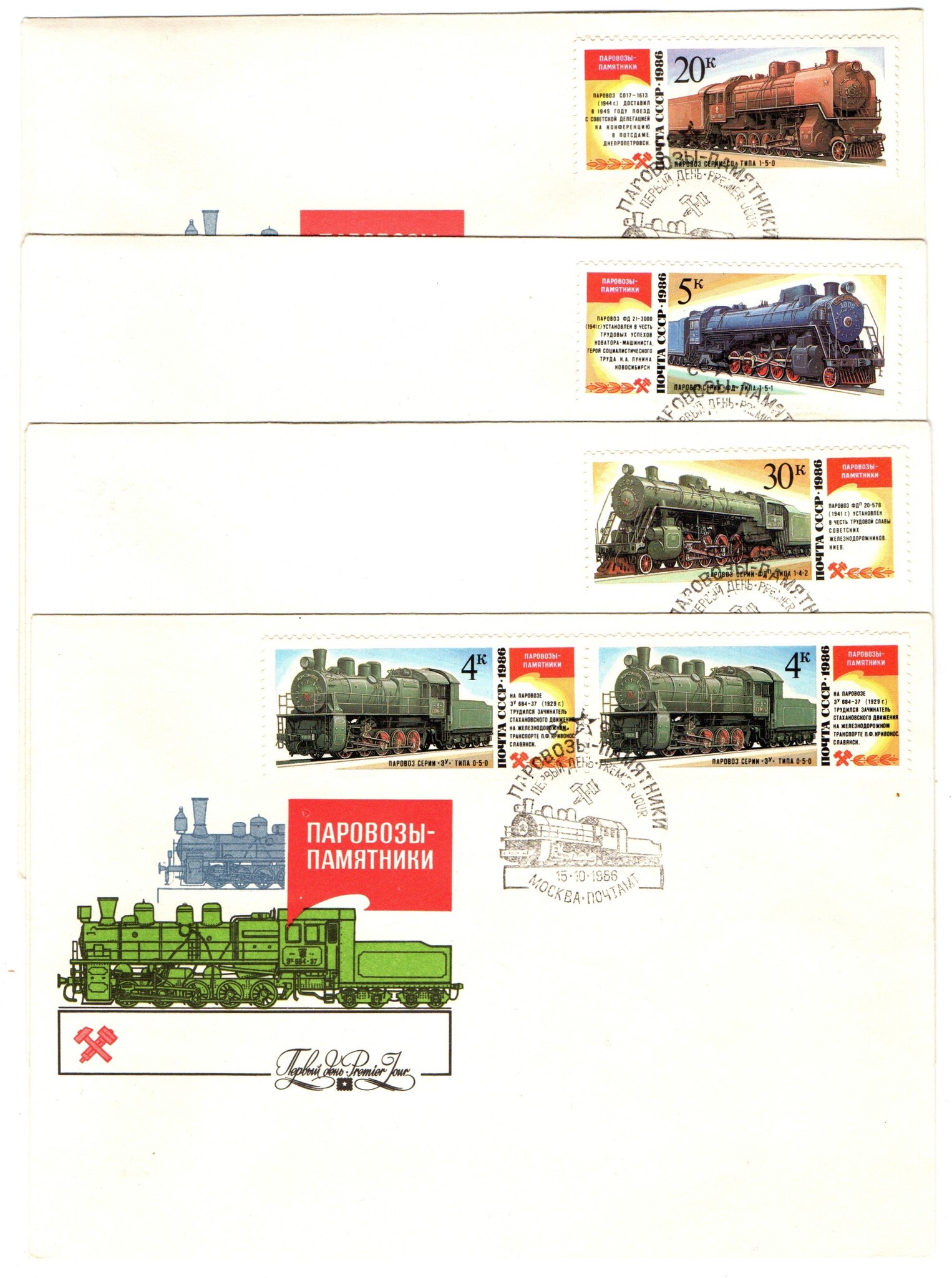 Конверты Паровозы- памятники. Конверт первого дня. Печать. 4 шт. 1986 г. Разные XF