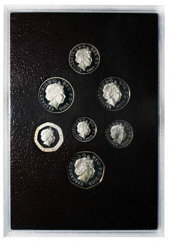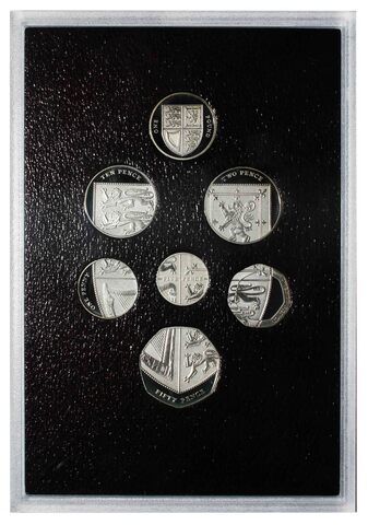 Выпуск набора приурочен к важному историческому событию Великобритании - смене дизайна разменных монет страны, который в неизменном виде просуществовал почти 40 лет. В настоящий набор включены монеты всех номиналов разменных металлических денег, а также монета номиналом 1 фунт стерлингов, выполненные в новым дизайне. Основой нового дизайна является центральная часть королевского герба Великобритании - гербовый щит. Щит поделён на четыре части: на первой и четвёртой частях изображены три идущих льва - символы Англии, на второй части - стоящий на задних лапах лев в ограничивающей его рамке - символ Шотландии, на третьей части - арфа - символ Ирландии.