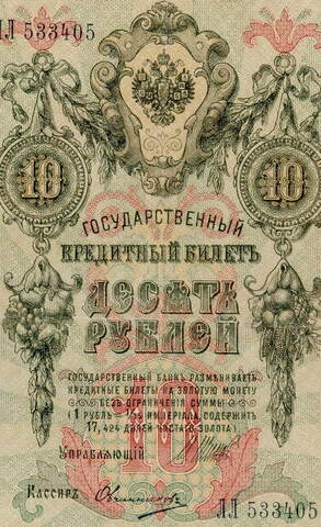 Кредитный билет 10 рублей 1909 год. Управляющий Шипов, кассир Овчинников ЛЛ 533405. VF