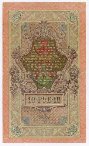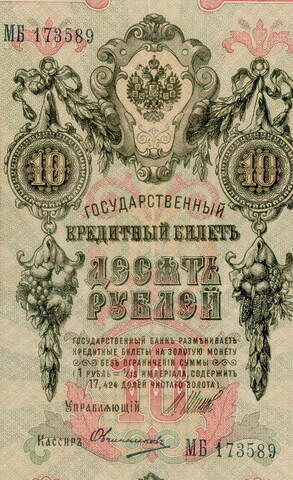 Кредитный билет 10 рублей 1909 год. Управляющий Шипов, кассир Овчинников МБ 173589. VF+