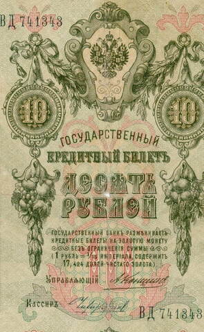 Кредитный билет 10 рублей 1909 года. Управляющий Коншин, кассир Чихиржин ВД 741343. VG
