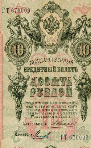 Кредитный билет 10 рублей 1909 года. Управляющий Коншин, кассир Михеев ГТ 670009. VG