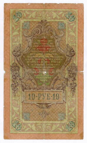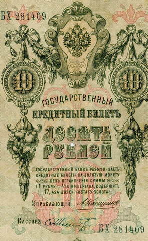 Кредитный билет 10 рублей 1909 года. Управляющий Коншин, кассир Шмидт БХ 281409. VG