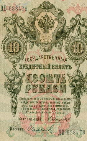 Кредитный билет 10 рублей 1909 года. Управляющий Коншин, кассир Софронов ДВ 638478. G-VG