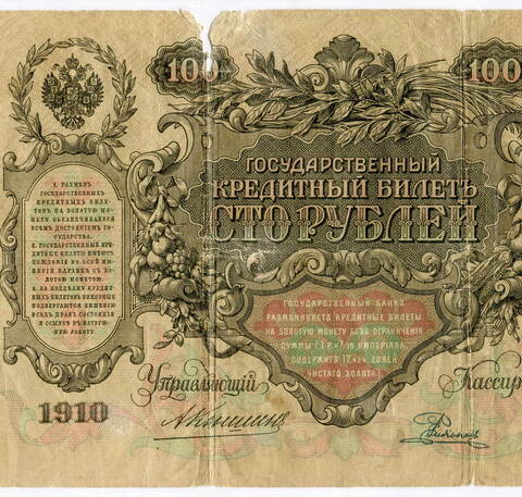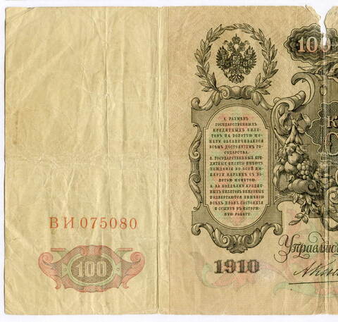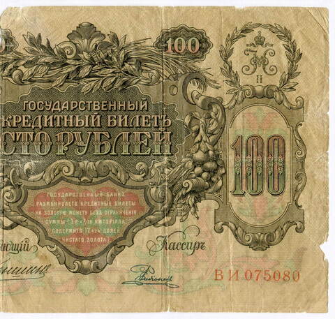 Кредитный билет 100 рублей 1910 год. Управляющий Коншин, кассир Родионов ВИ 075080. G