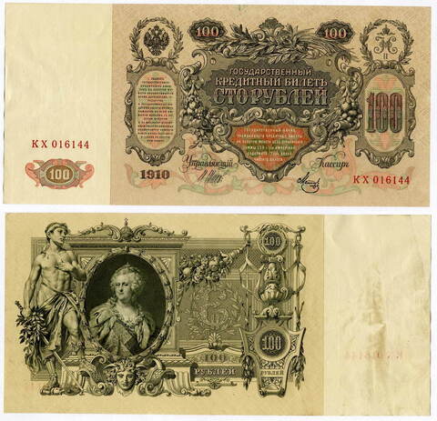 Аверс: на левой верхней части банкноты изображен малый государственный герб образца 1883 года. Правее по центру надпись «Государственный кредитный Билет» и номинал прописью «СТО РУБЛЕЙ» ниже надпись «Государственный Банк разменивает кредитные билеты на золотую монету …)». Имеются подписи управляющего и кассира. В левом нижнем углу год выпуска образца «1910». Также имеется выдержка из закона от 14 ноября 1897 года.