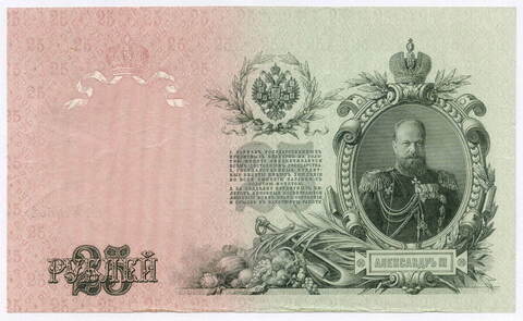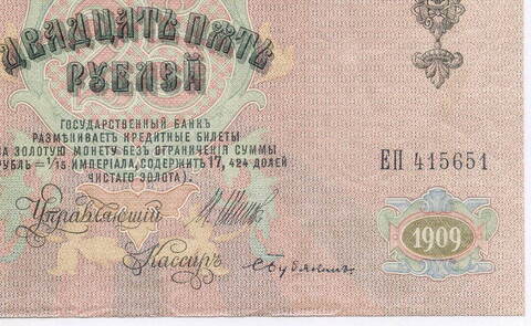 Кредитный билет 25 рублей 1909 год. Управляющий Шипов, кассир Бубякин ЕП 415651 . XF