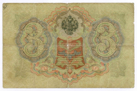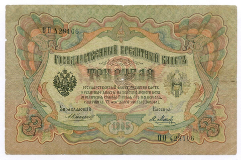Кредитный билет 3 рубля 1905 год. Управляющий Коншин, кассир Я Метц ОО 428106. VG