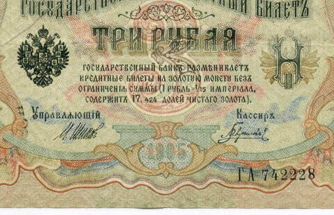 Кредитный билет 3 рубля 1905 год. Управляющий Шипов, кассир Гаврилов ГА 742228. VF