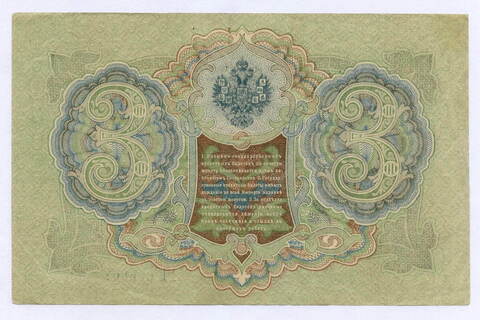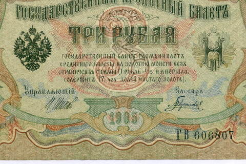 Кредитный билет 3 рубля 1905 год. Управляющий Шипов, кассир Гаврилов ГВ 606807. VF-XF