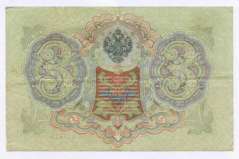 Кредитный билет 3 рубля 1905 год. Управляющий Шипов, кассир Гаврилов ХГ 941815. VF