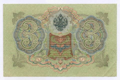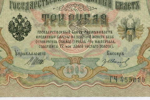 Кредитный билет 3 рубля 1905 год. Управляющий Шипов, кассир Гр Иванов ГЧ 455010. VF-XF
