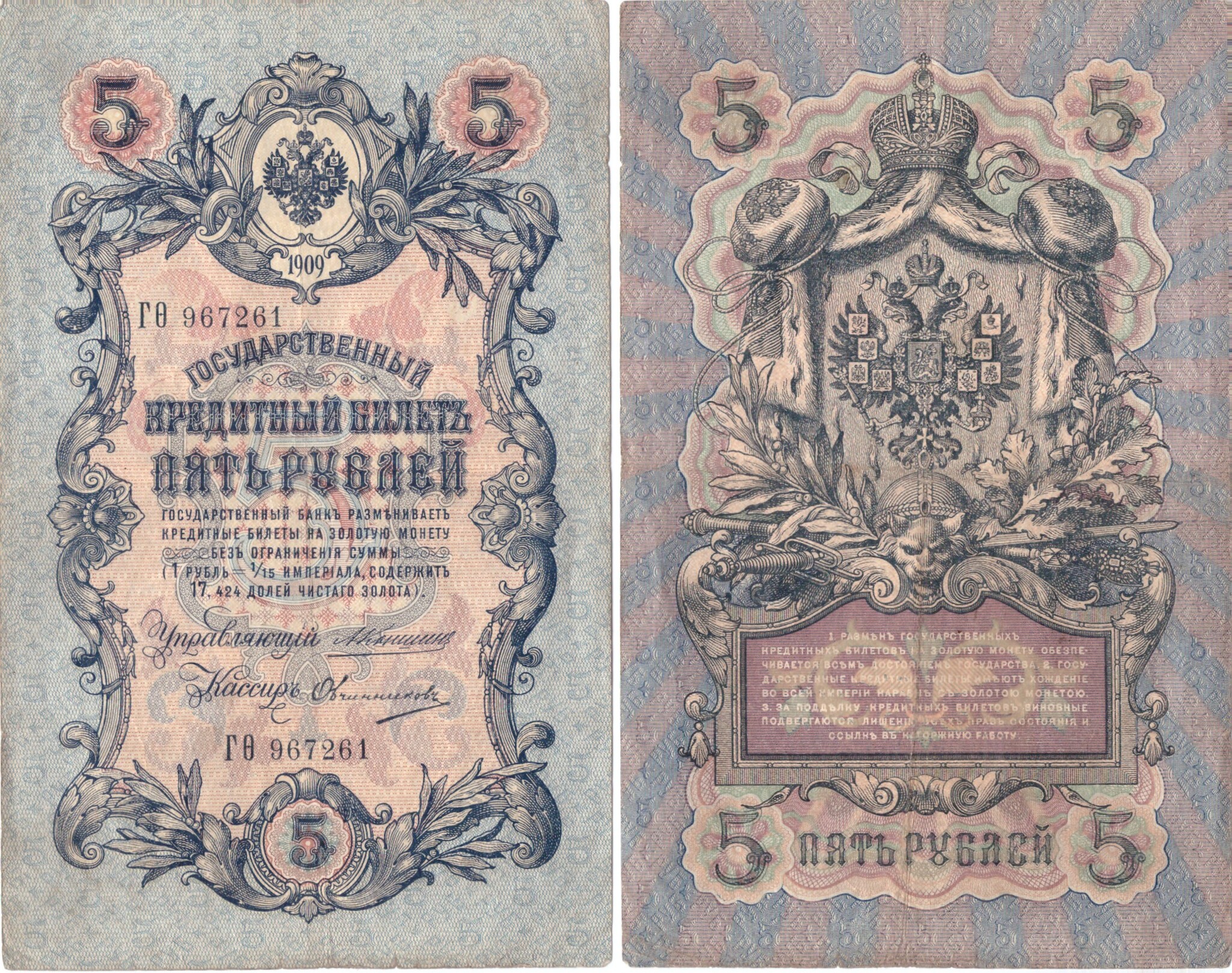Кредитный билет 5 рублей 1909 год. Управляющий Коншин, кассир Овчинников ГО 967261. VF