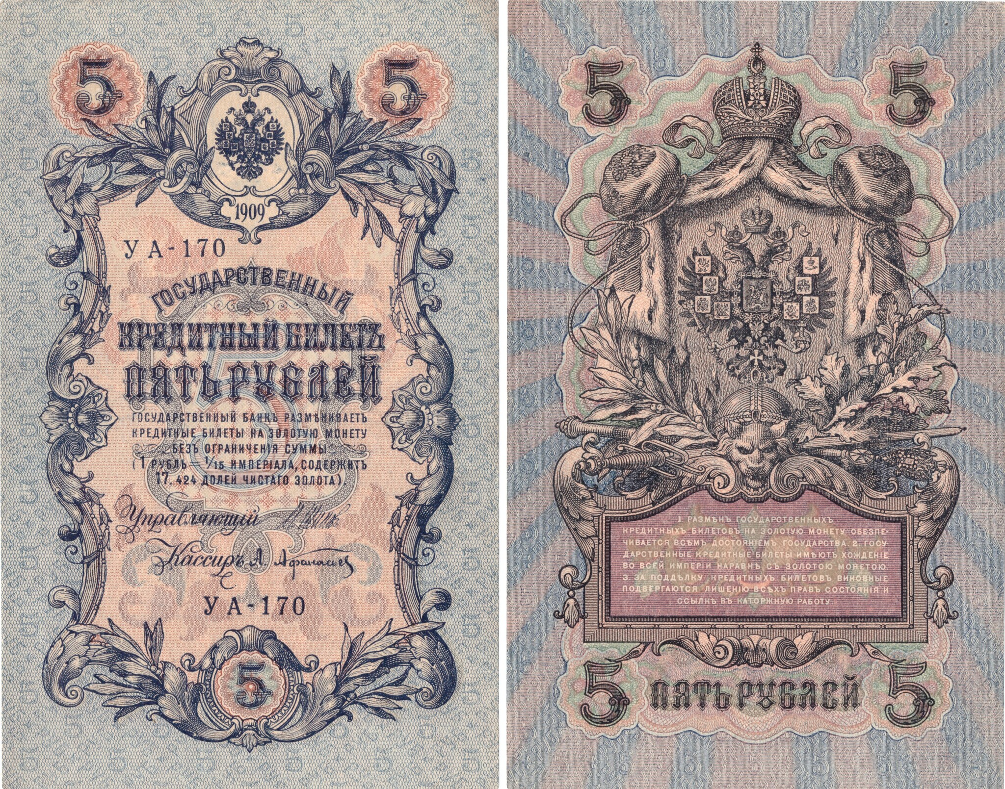Кредитный билет 5 рублей 1909 года. Кассир Афанасьев. Управляющий Шипов (серия УА 170). VF-XF