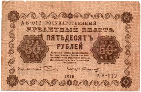 Кредитный билет 50 рублей 1918 год - Серия АБ-012 F-