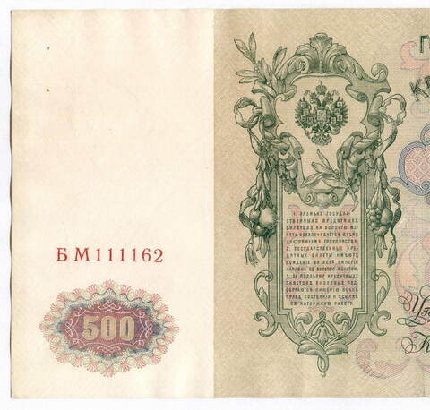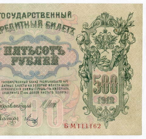 Кредитный билет 500 рублей 1912 год. Управляющий Шипов, кассир Метц БМ 111162. VF-XF