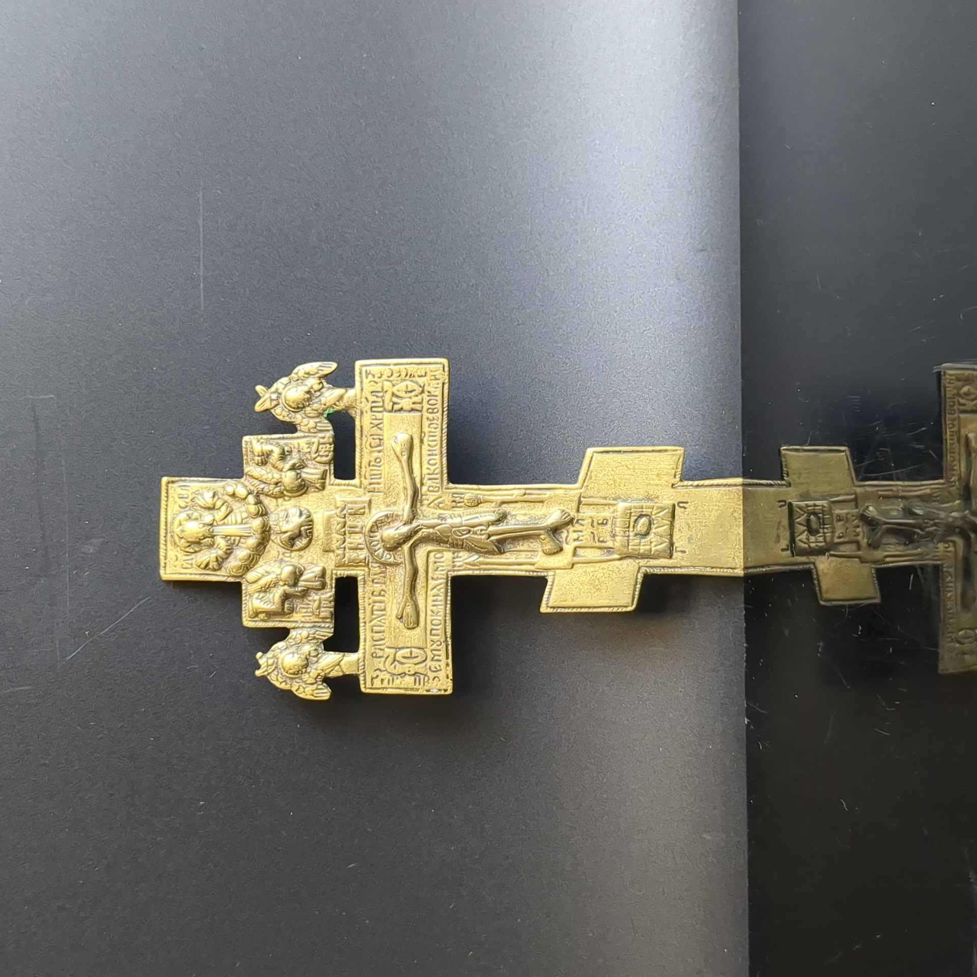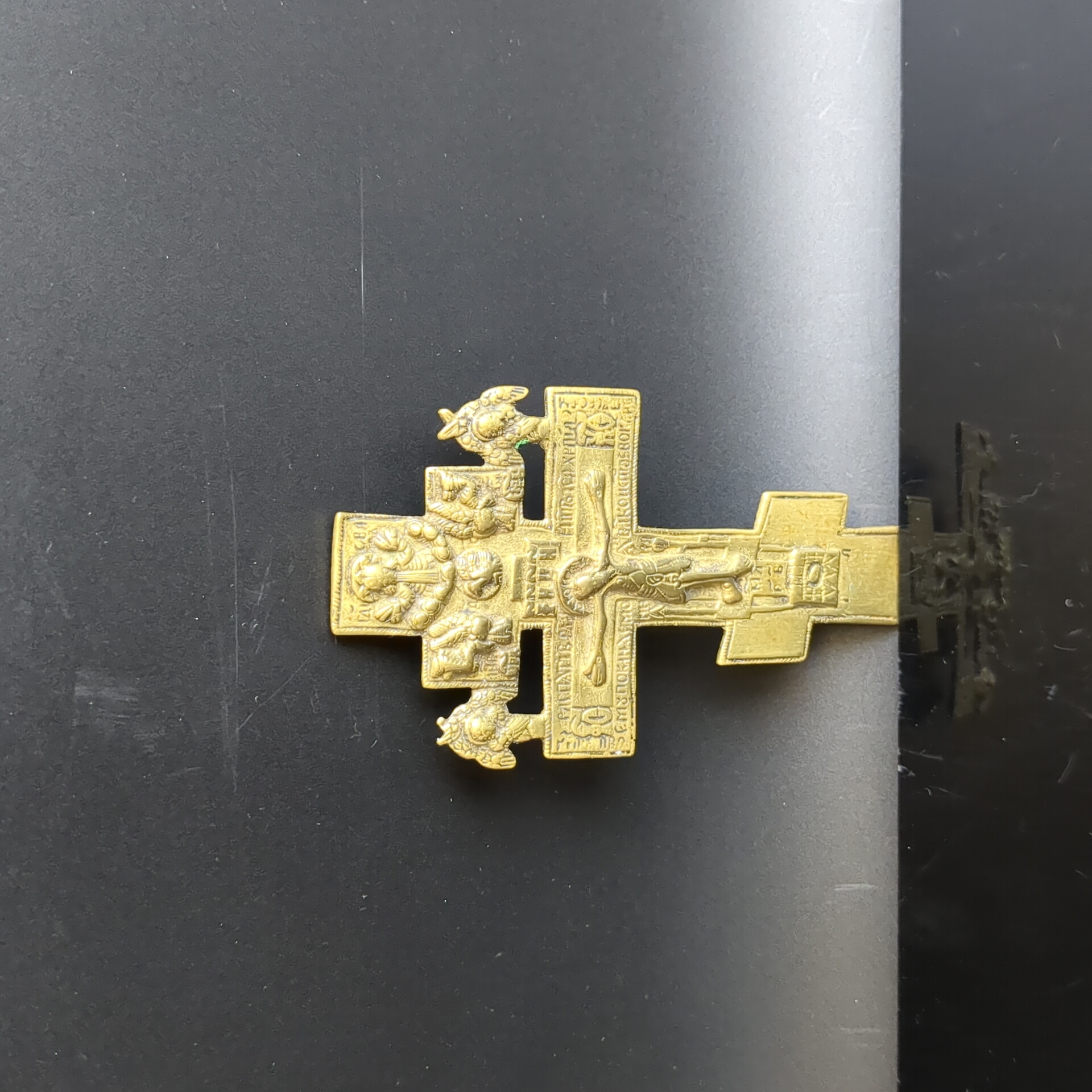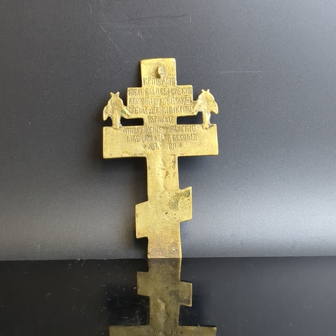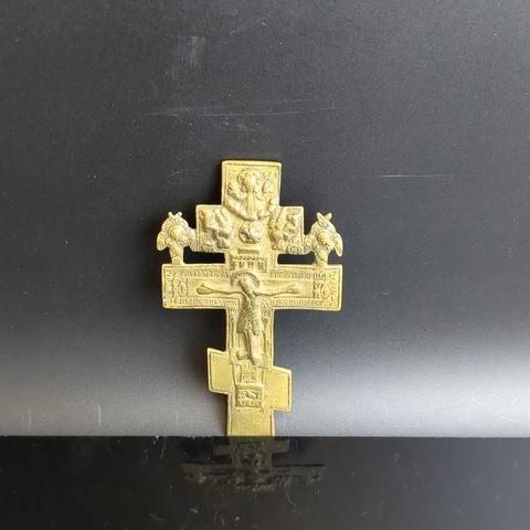 Крест киотно - наперсный с херувимами латунь, Российская империя, 1850-1900 гг. Размер 121 х 68 мм. Крест 19 века с рельефным изображением фигуры распятого Иисуса Христа и символами Святой Троицы. В верхней части креста помещен Бог-отец в виде "Царя Славы" с коленопреклоненными фигурами ангелов. Ниже представлено изображение другой ипостаси единого Бога — Дух Святой в виде голубя. Далее - распятый на кресте Бог-сын — Иисус Христос. Таким образом, перед нами своеобразная схема Троицы. По обе стороны от рукавов Голгофского креста надпись с титлами: "IС ХС". Над головой распятого Иисуса Христа надпись из четырех заглавных букв: "IНЦИ", которая расшифровывается так: "Иисус Назареянин Царь Иудейский".