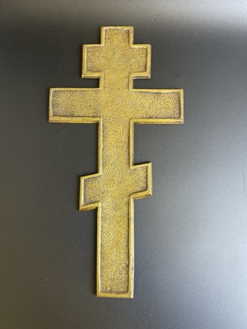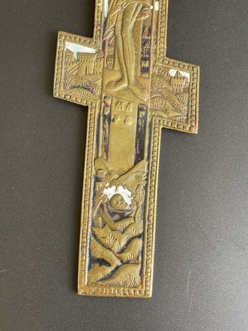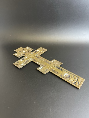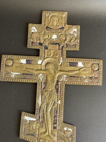 Крест с Распятием Иисуса Христа отливает бронзовым блеском, которую не скрыла даже вековая патина. Данный киотный крест Распятие Христово можно купить для своего Красного домашнего угла.