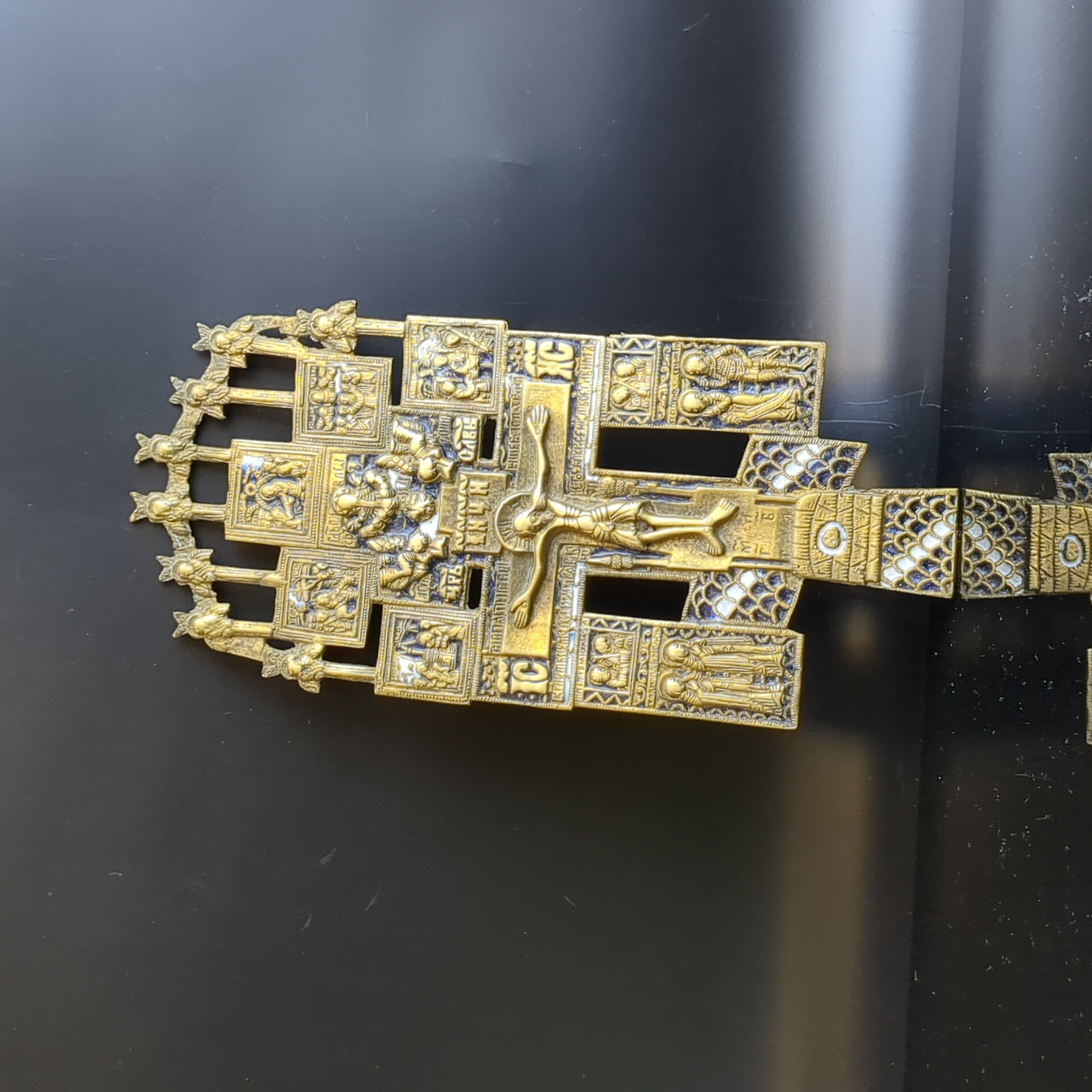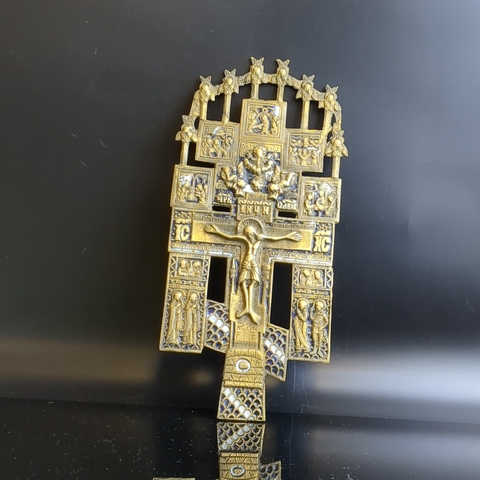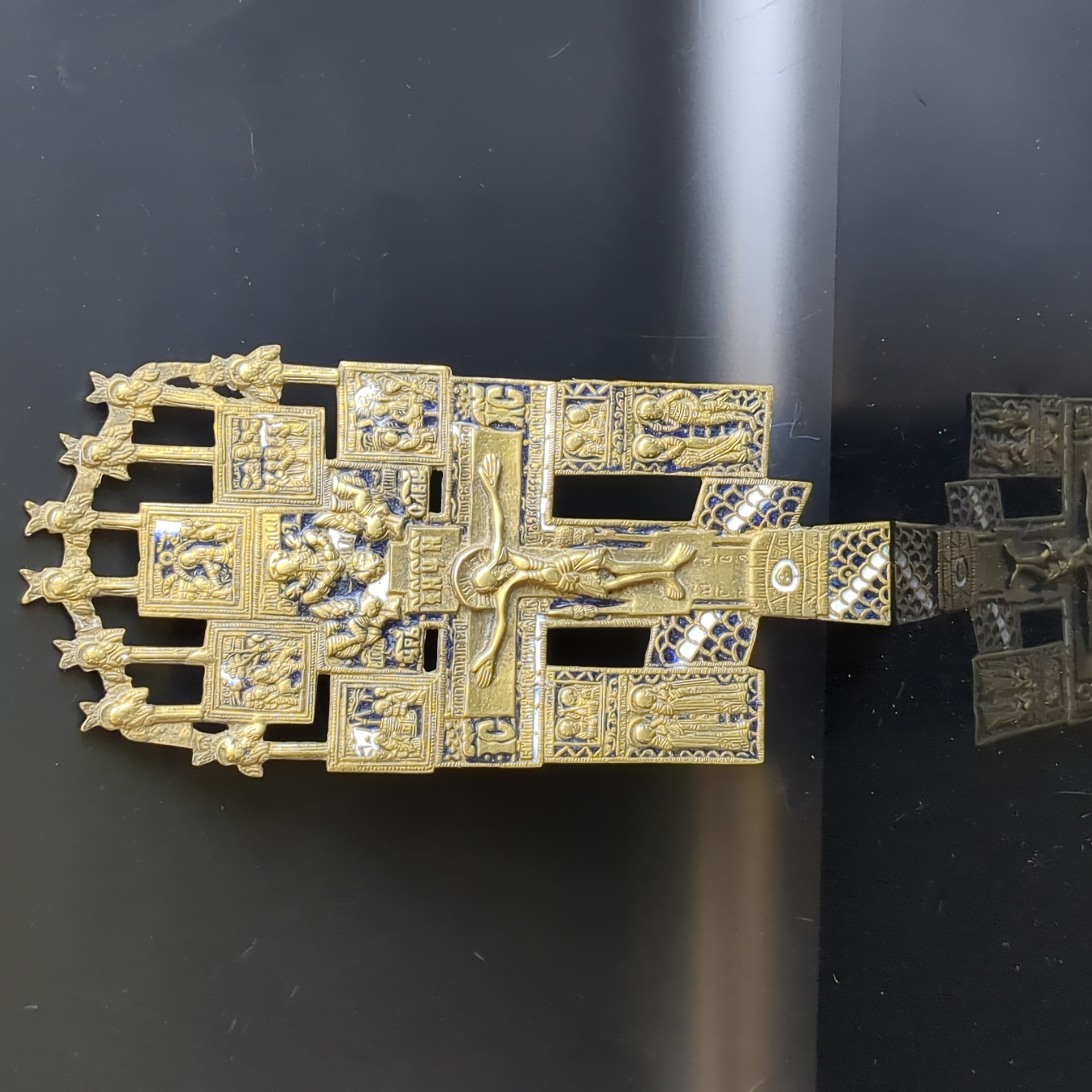 Крест "Распятие Христово с предстоящими и избранными иконами", навершие с херувимами, бронза, литье, цветные эмали, Российская Империя, 1850-1890 гг.
