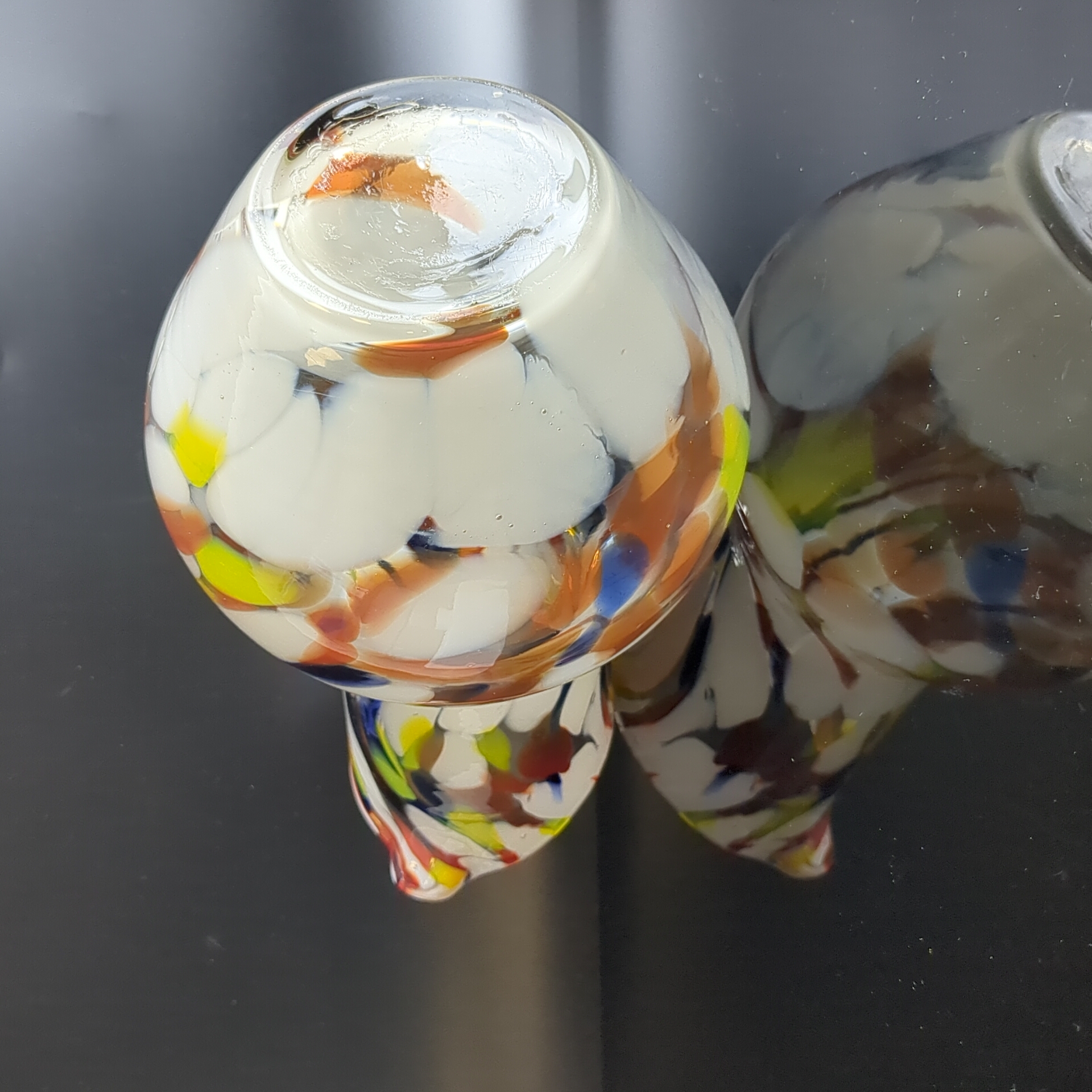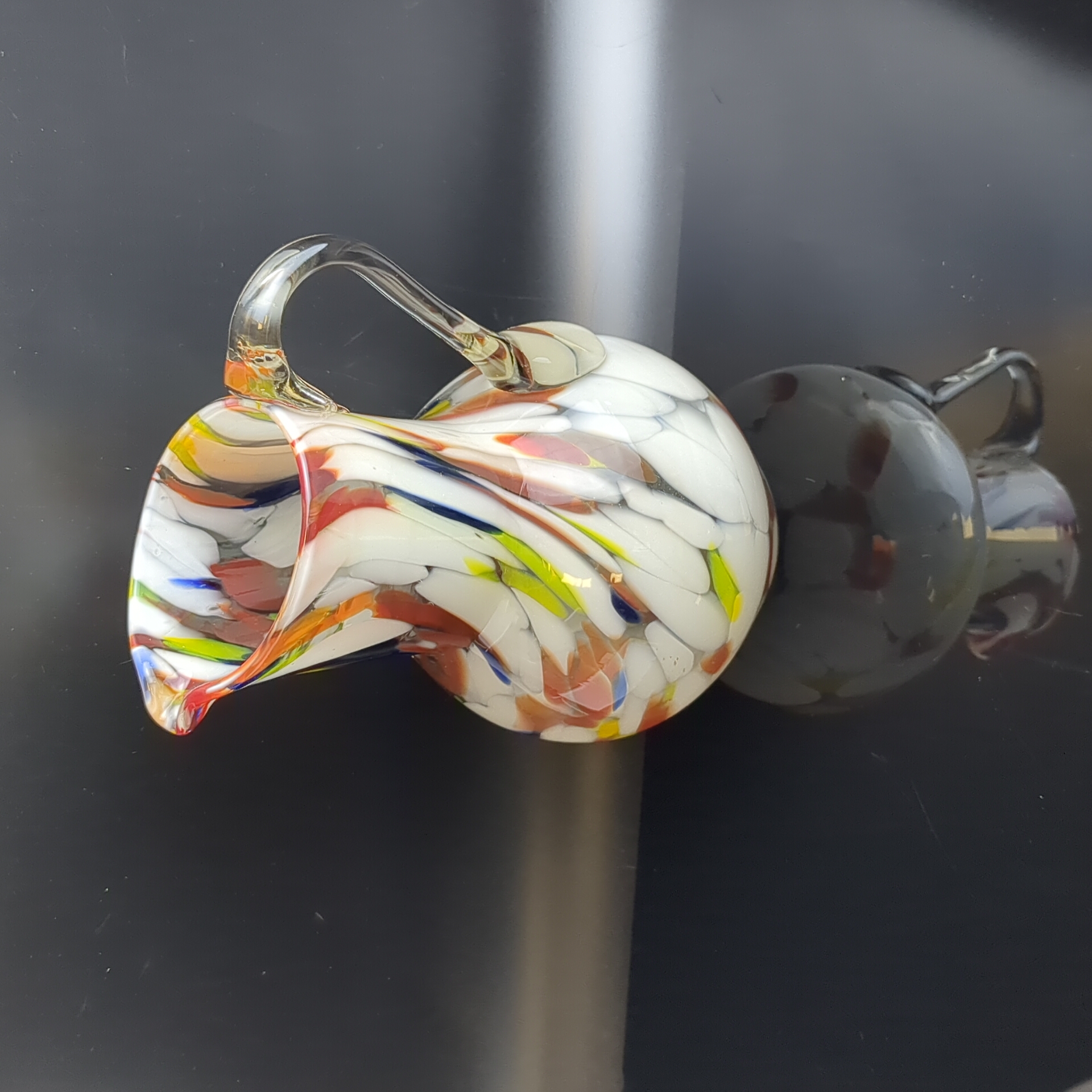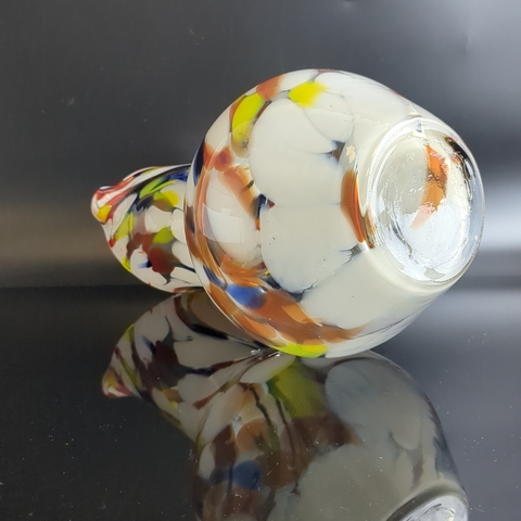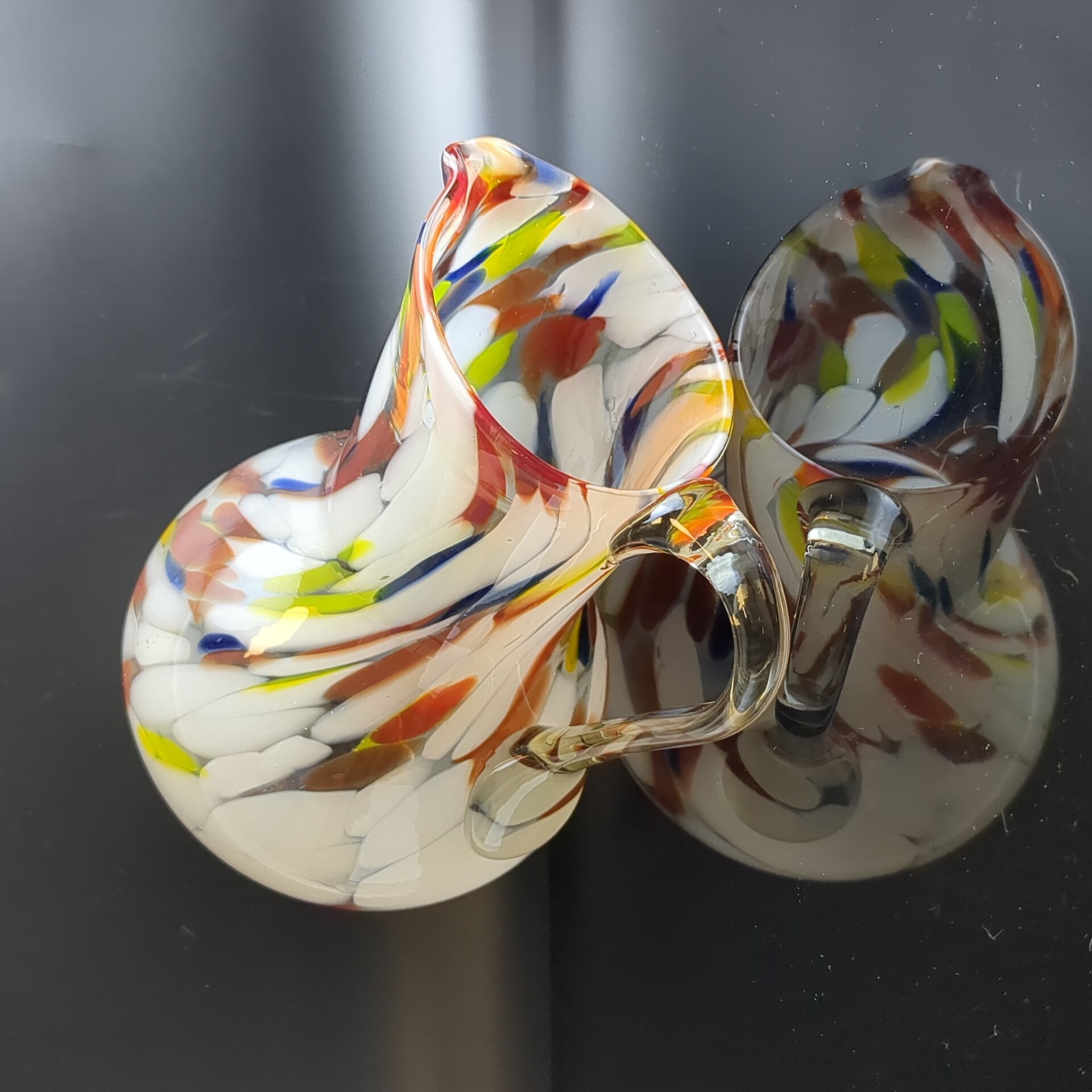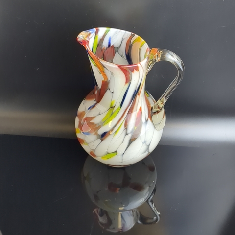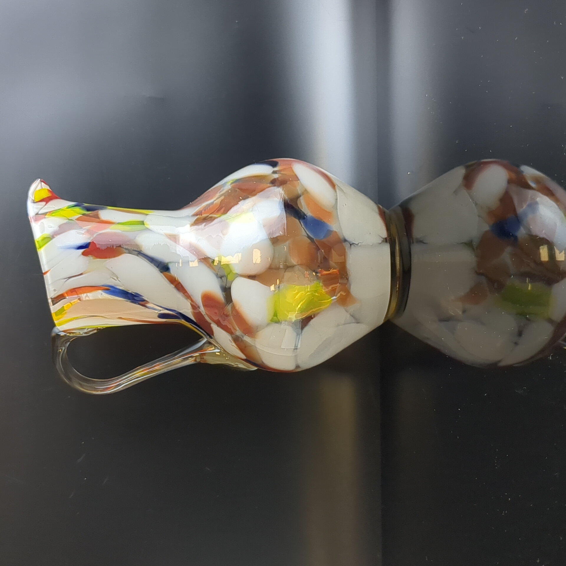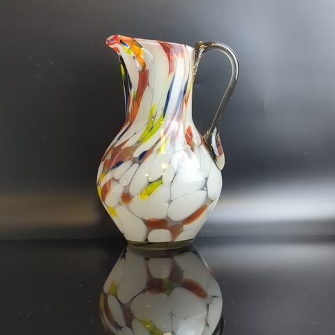 Кувшин для напитков из цветного стекла красное, молочное, синее, желтое, гутная техника, высота - 20 см, винтаж СССР 1970-1990 гг. Состояние на фото