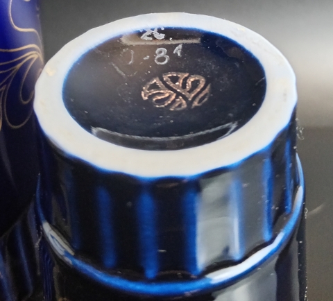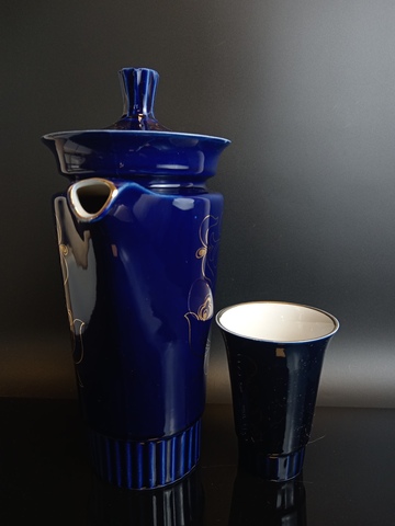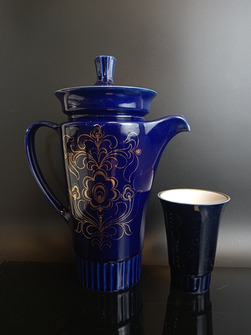 Кувшин фарфоровый со стаканом, клеймо Новгородский ФЗ "Возрождение", кобальт, позолота, СССР 1970-1990 гг. Высота кувшина - 28 см, высота стакана - 11.5 см. Состояние на фото