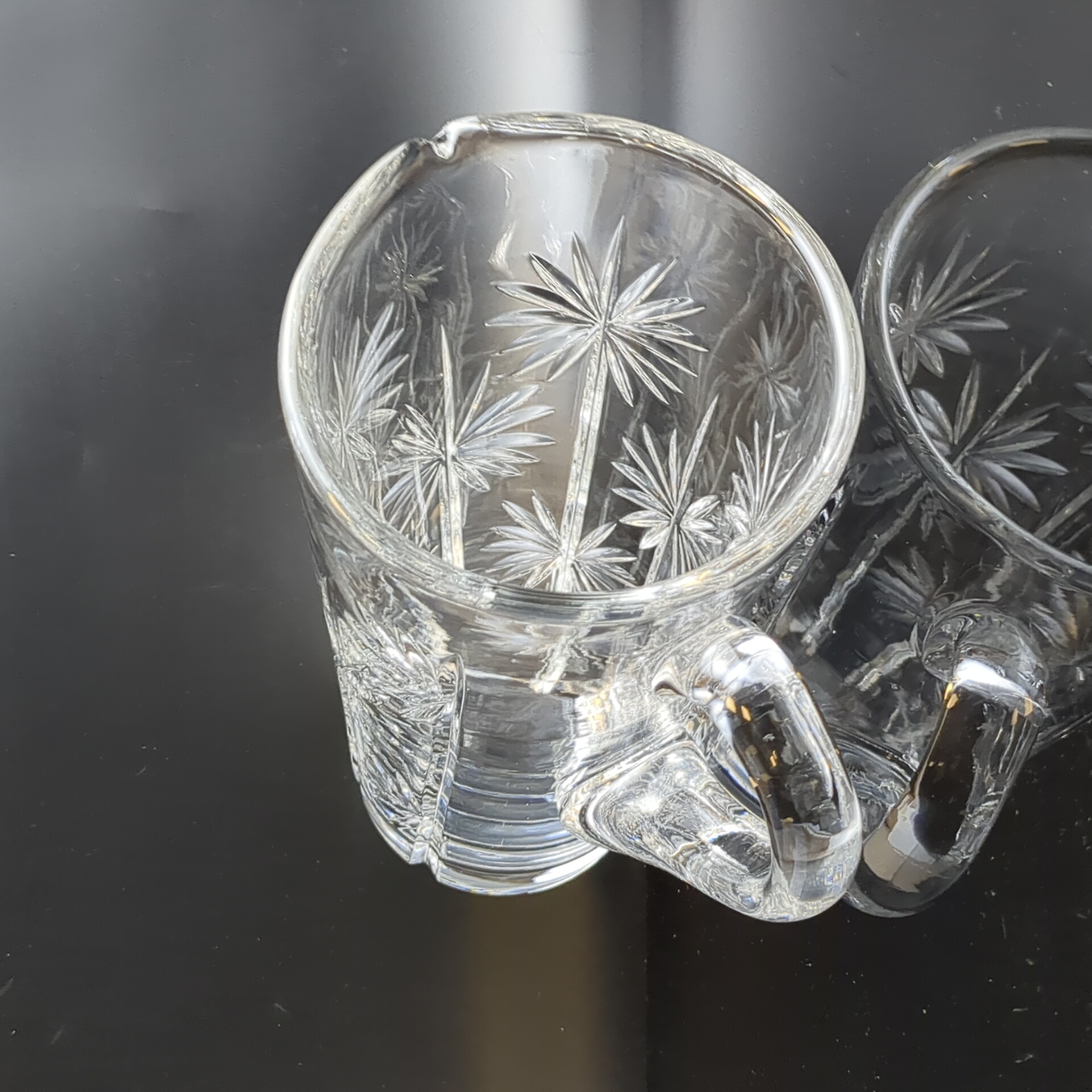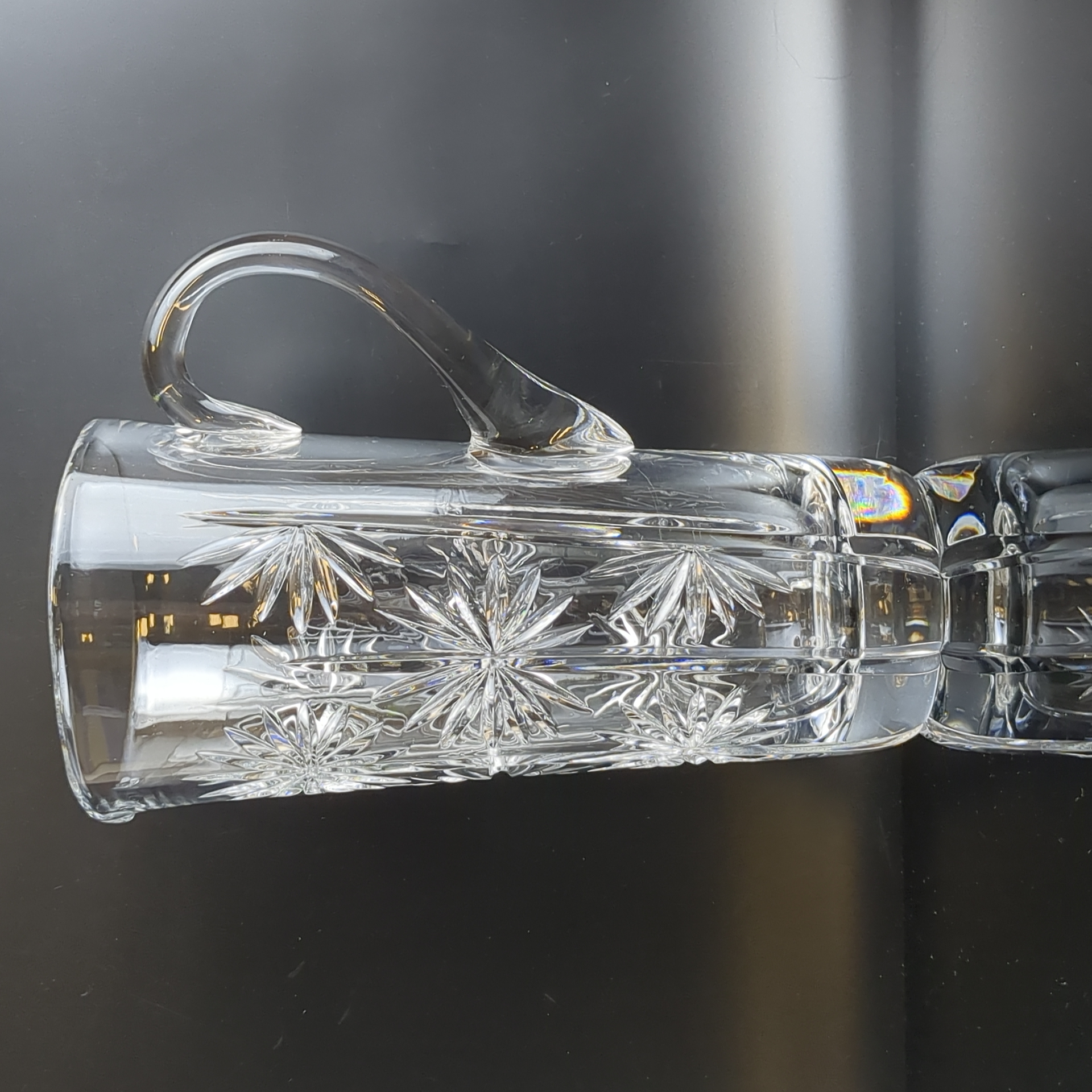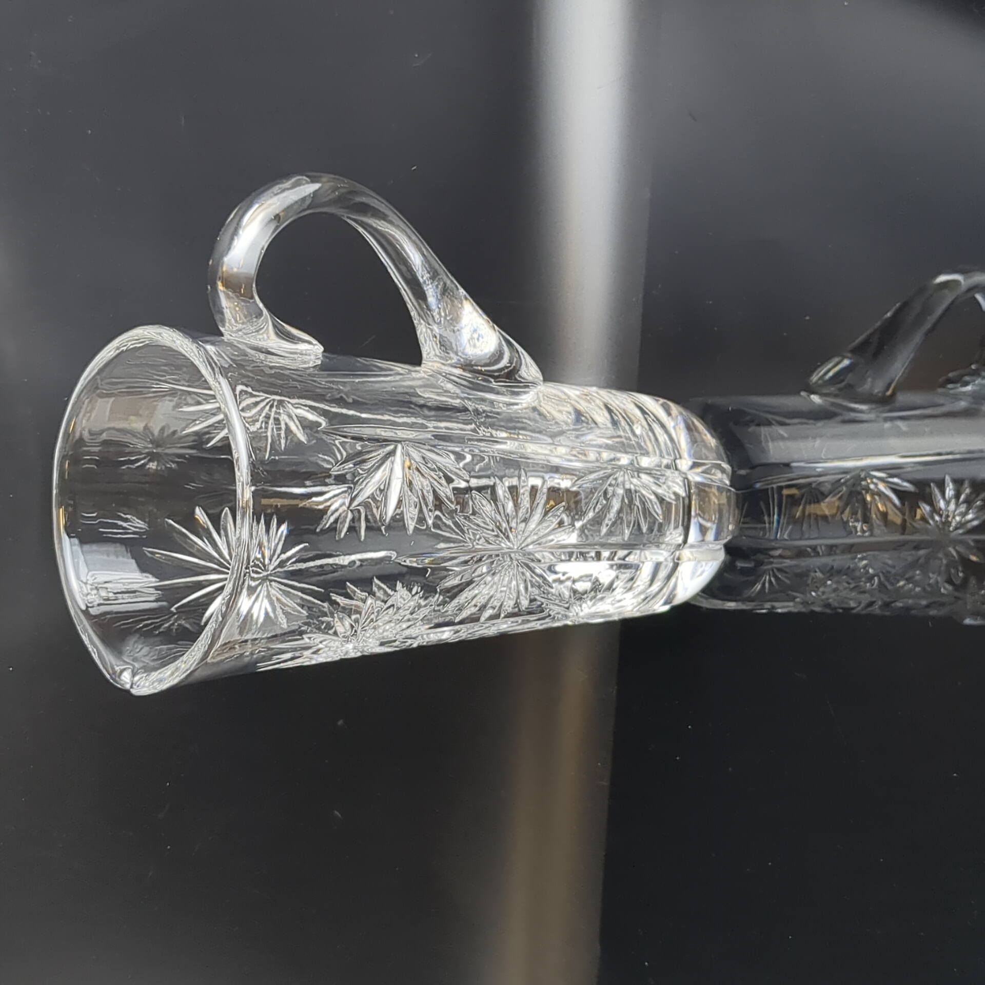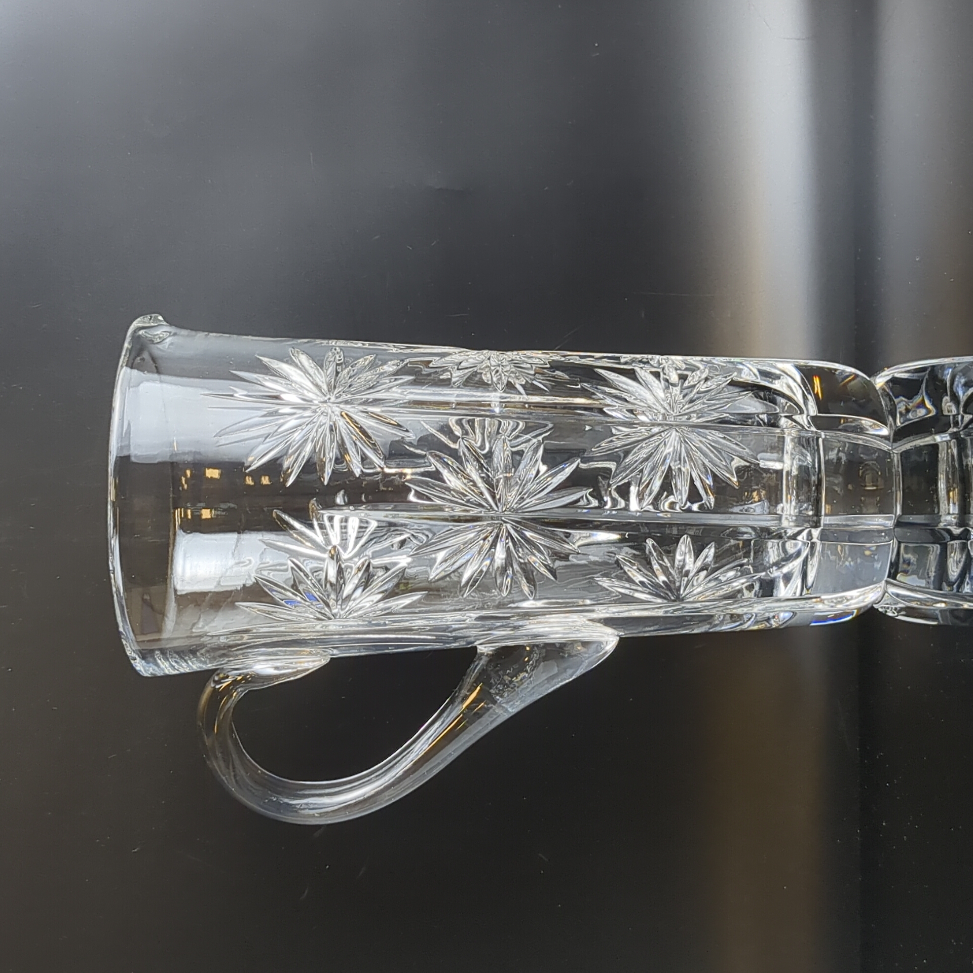 Кувшин хрустальный с ручкой, алмазная грань, геометрический орнамент, высота - 23.5 см, винтаж СССР 1970-1990 гг. Хрустальный декорированный ручной алмазной резкой под прохладные напитки или воду. Состояние на фото.