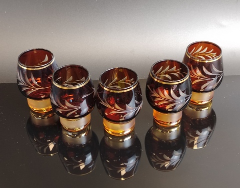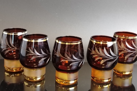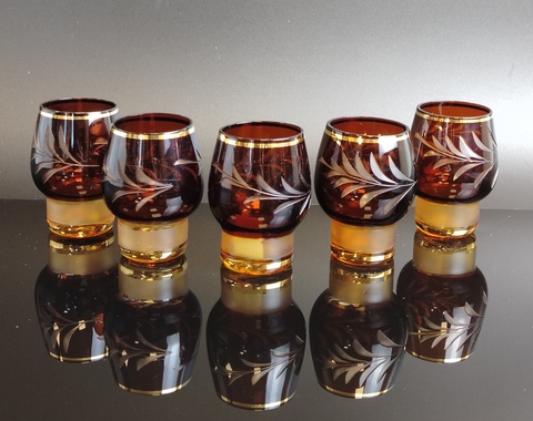 Ликерные рюмки Богемия , Bohemia из 5 штук, 50 мл , Чехословакия, янтарное стекло, позолота, ручная гравировка, винтаж 1970-х гг. Высота - 6 см. Сервантное хранение - состояние на фото
