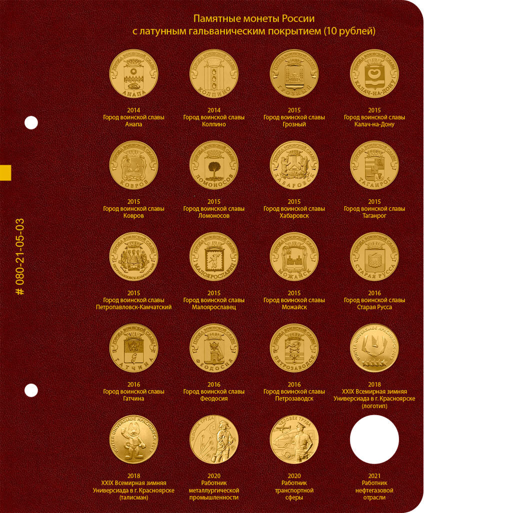 На листе учитываются памятные монеты России для обращения номиналом 10 рублей с латунным гальваническим покрытием 2014-2021 годов выпуска. Т.е. так называемые «жёлтенькие десятки» с памятным дизайном, которые входят в серию "Города воинской славы (ГВС)", "универсиада в Красноярске", "Человек труда".