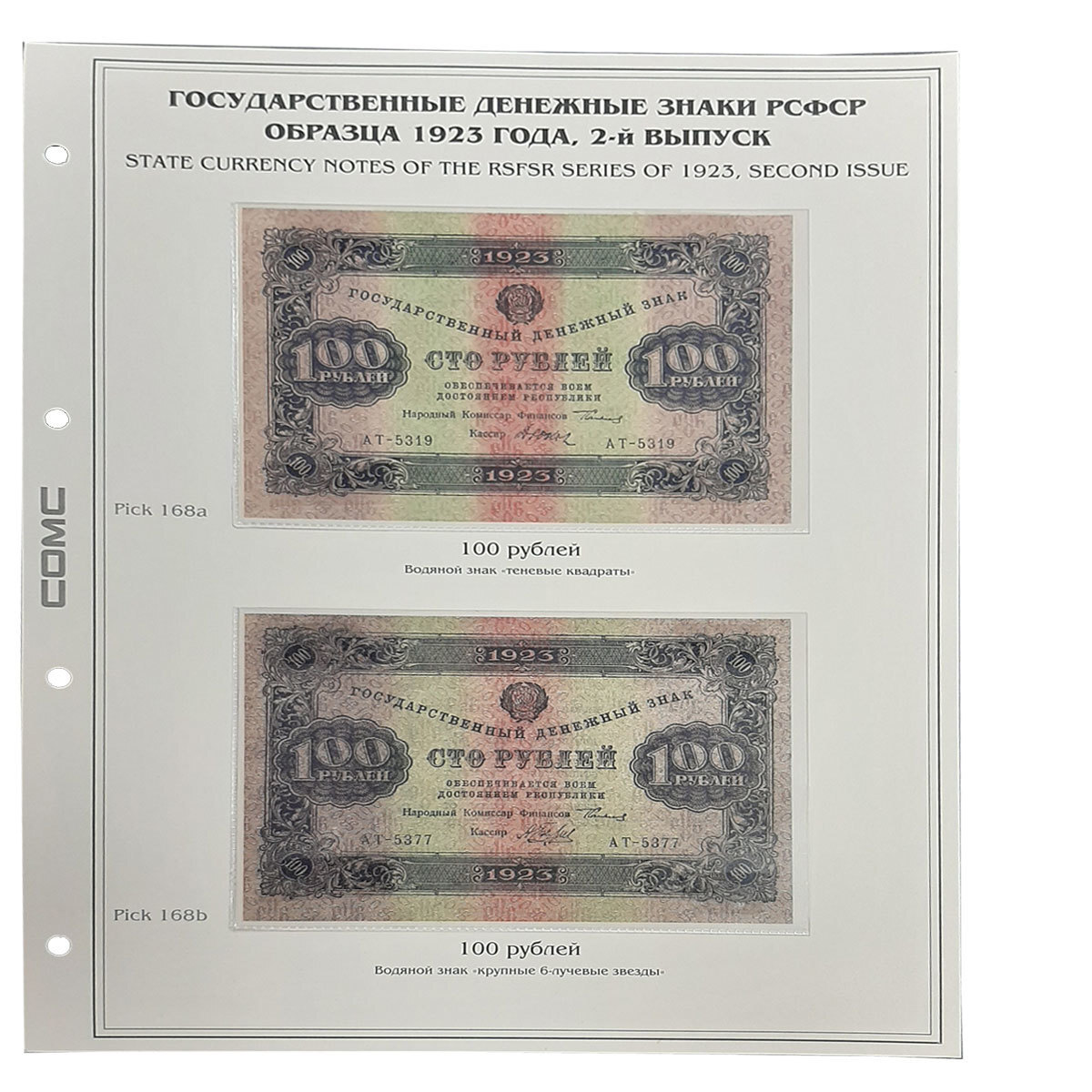 Лист тематический для банкнот РСФСР 100 рублей 1923 г. (разновид по В/З) 2-й выпуск. (картон с холдером) GRAND 243*310