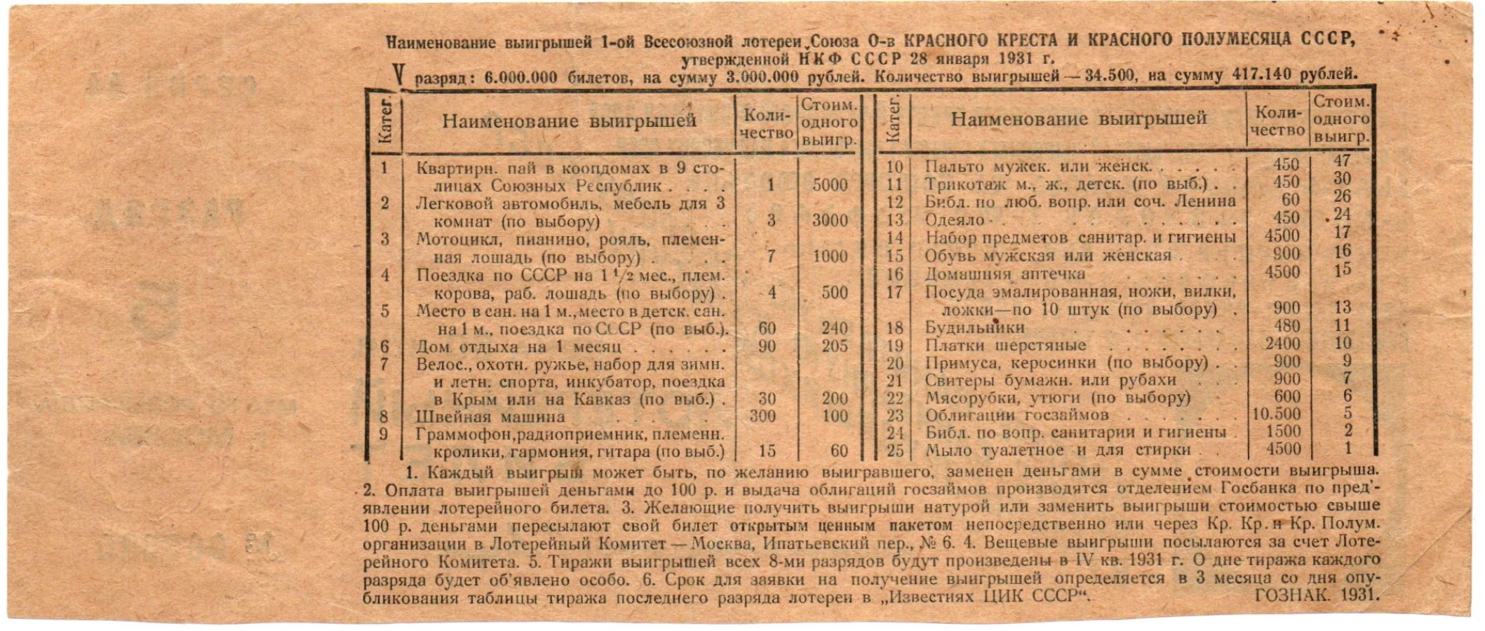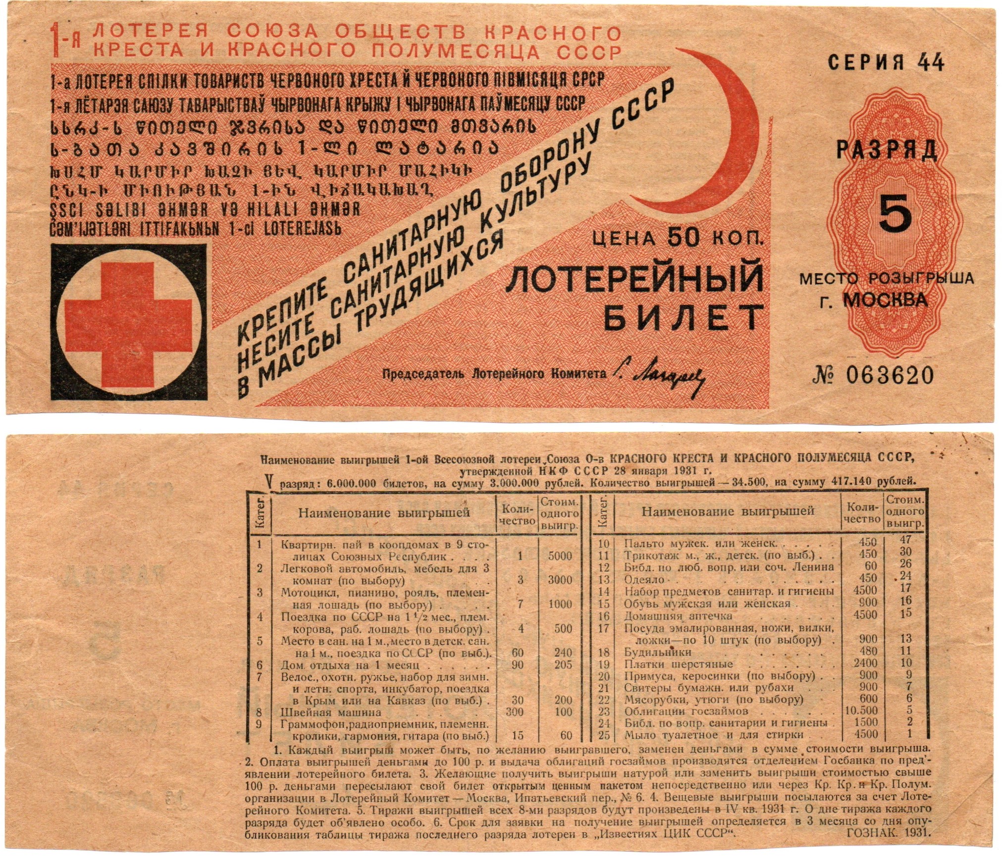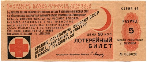 Лотерейный билет 1931 года, Первая лотерея обществ Красного Креста, 5 разряд, г. Москва