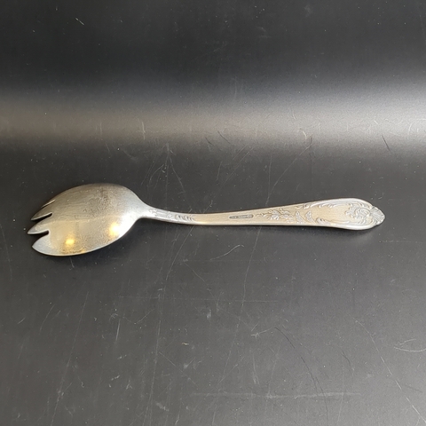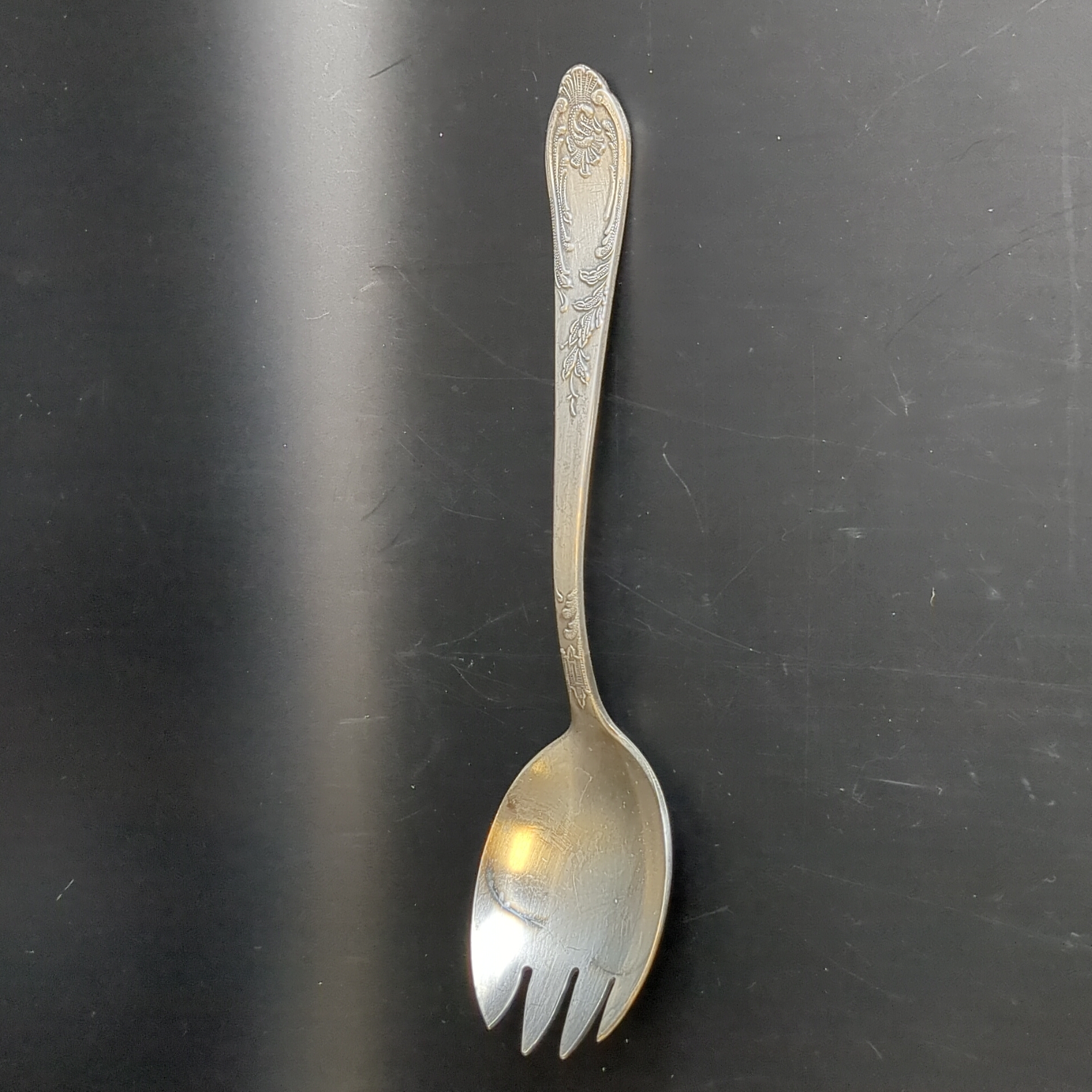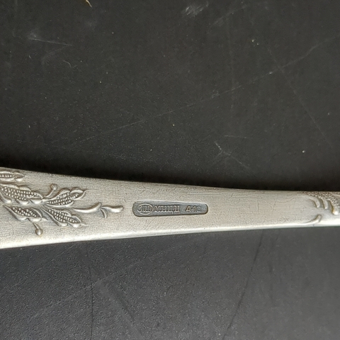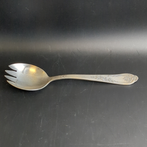 Ложка салатная, украшенных цветочным декором, мНЦ (медь-никель-цинк), Вольнянский завод столовых приборов им. Шевченко (ЗiШ, ЗиШ), СССР, 1960-1990 гг. Длина ложки 22,3 см. Естественная патина, микроцарапинки