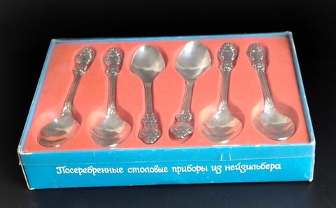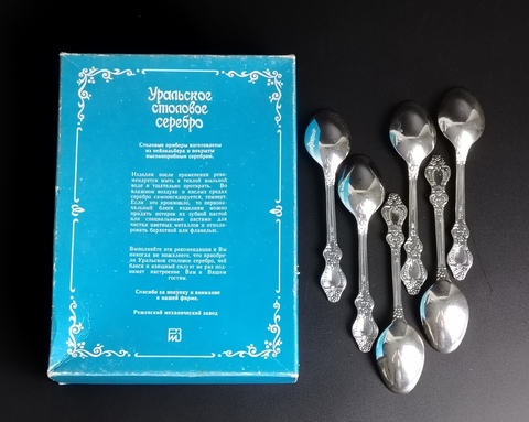 Ложки чайные набор из 6 штук из нейзильбера покрытые высокопробным серебром, клеймо МНЦ, в оригинальной упаковке, Режевский механический завод, времён СССР. Декор цветы, "серебряная роза", винтаж. Высота ложки- 14 см. Присутствуют следы использования - состояние на фото