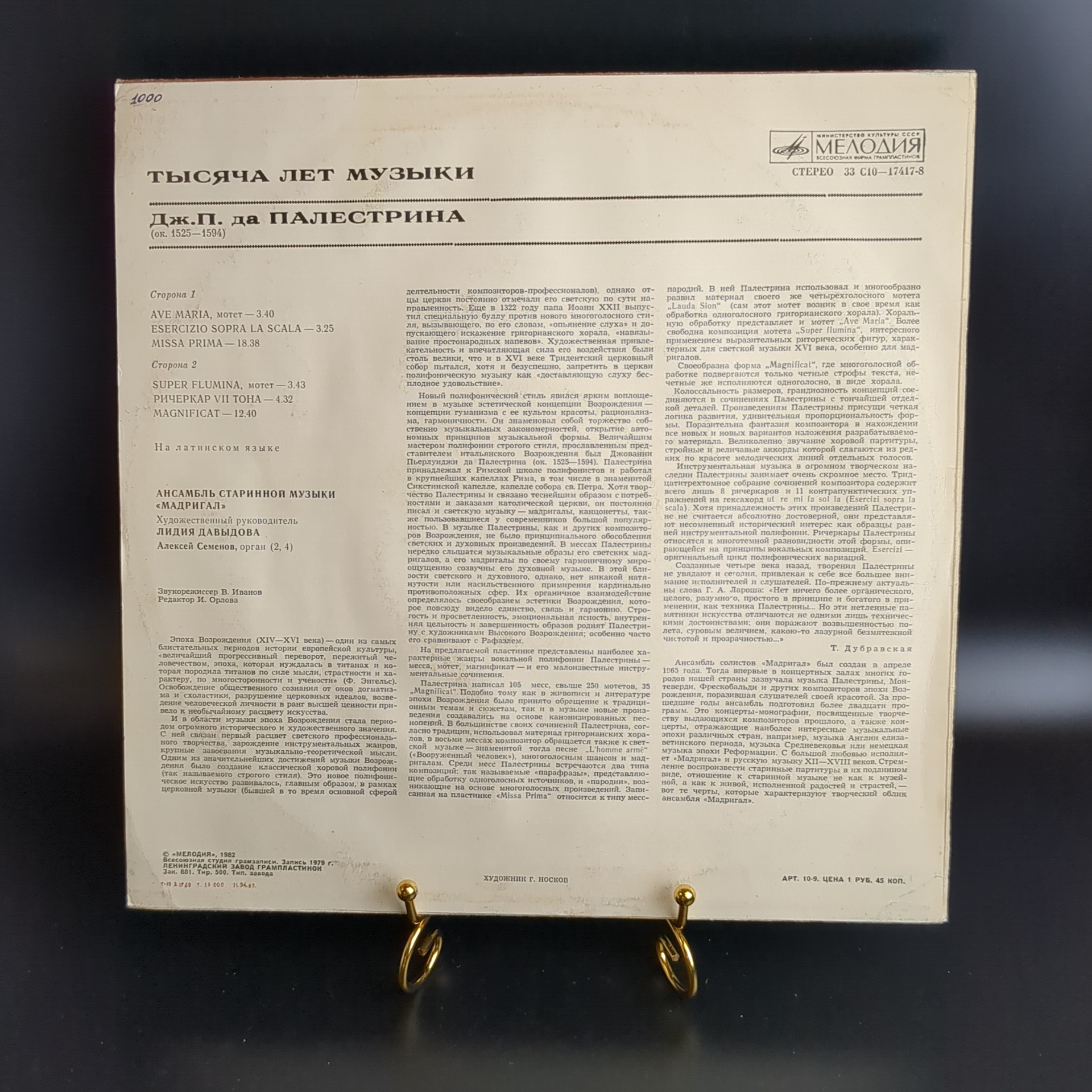 LP Дж. П. да Палестрина. Тысяча лет музыки. Старинная музыка. Ансамбль старинной музыки Мадригал. Художественный руководитель Лидия Давыдова. Виниловая пластинка 12 дюймов. Мелодия СССР 1982 год.