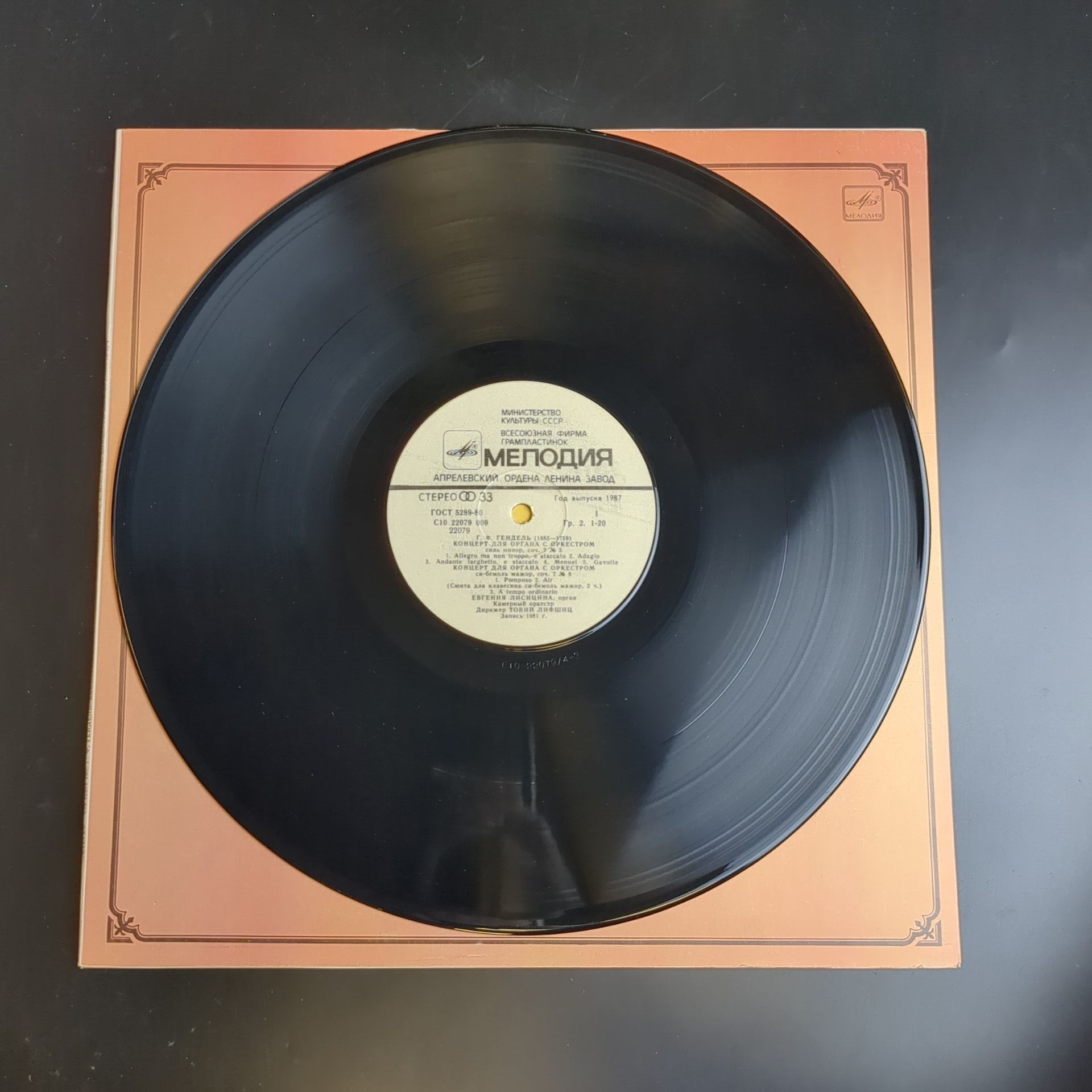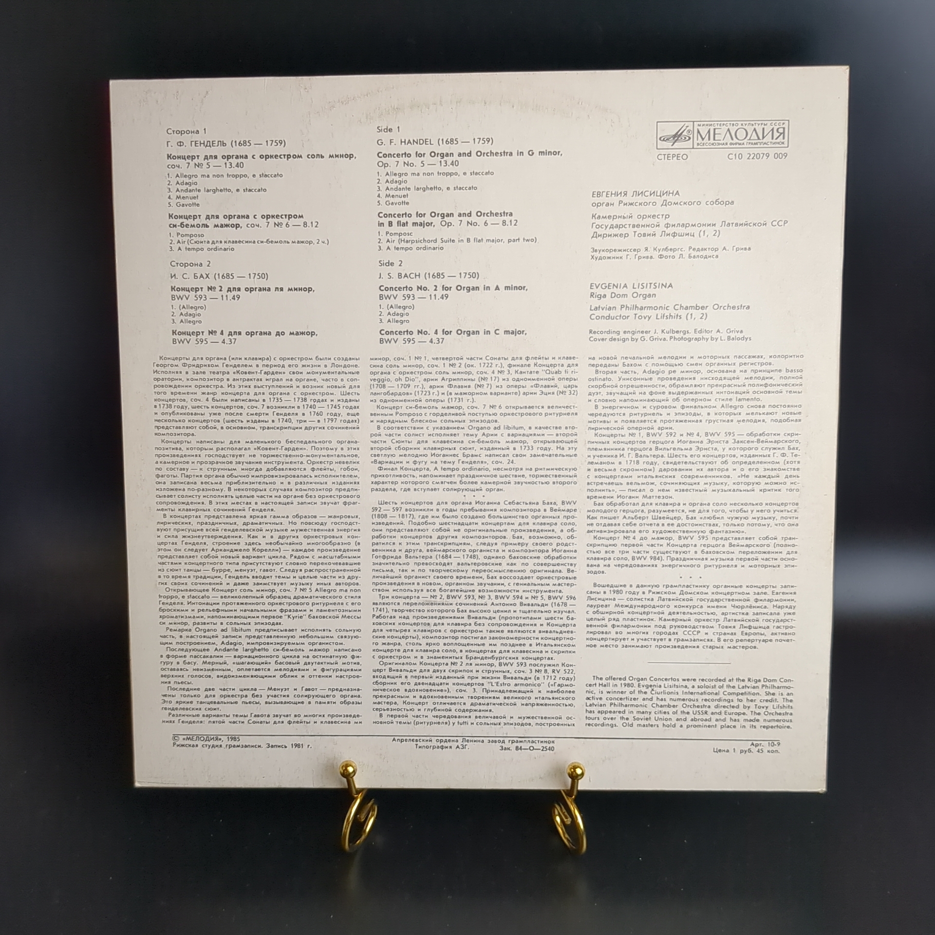 LP Г. Ф. Гендель. Концерт для органа с оркестром соль минор, соч. 7 №5. Концерт для органа с оркестром си-бемоль мажор, соч. 7 №6. И. С. Бах. Концерт №2 для органа ля минор. Концерт №4 для органа до мажор. Евгения Лисицина. Большой Орган Рижского Домского собора. Камерный оркестр Государственной филармонии Латвийской ССР. Дирижер Товий Лифшиц. Виниловая пластинка 12 дюймов. Мелодия СССР 1985 год. Классическая музыка на виниле. Конверт EX. Диск EX