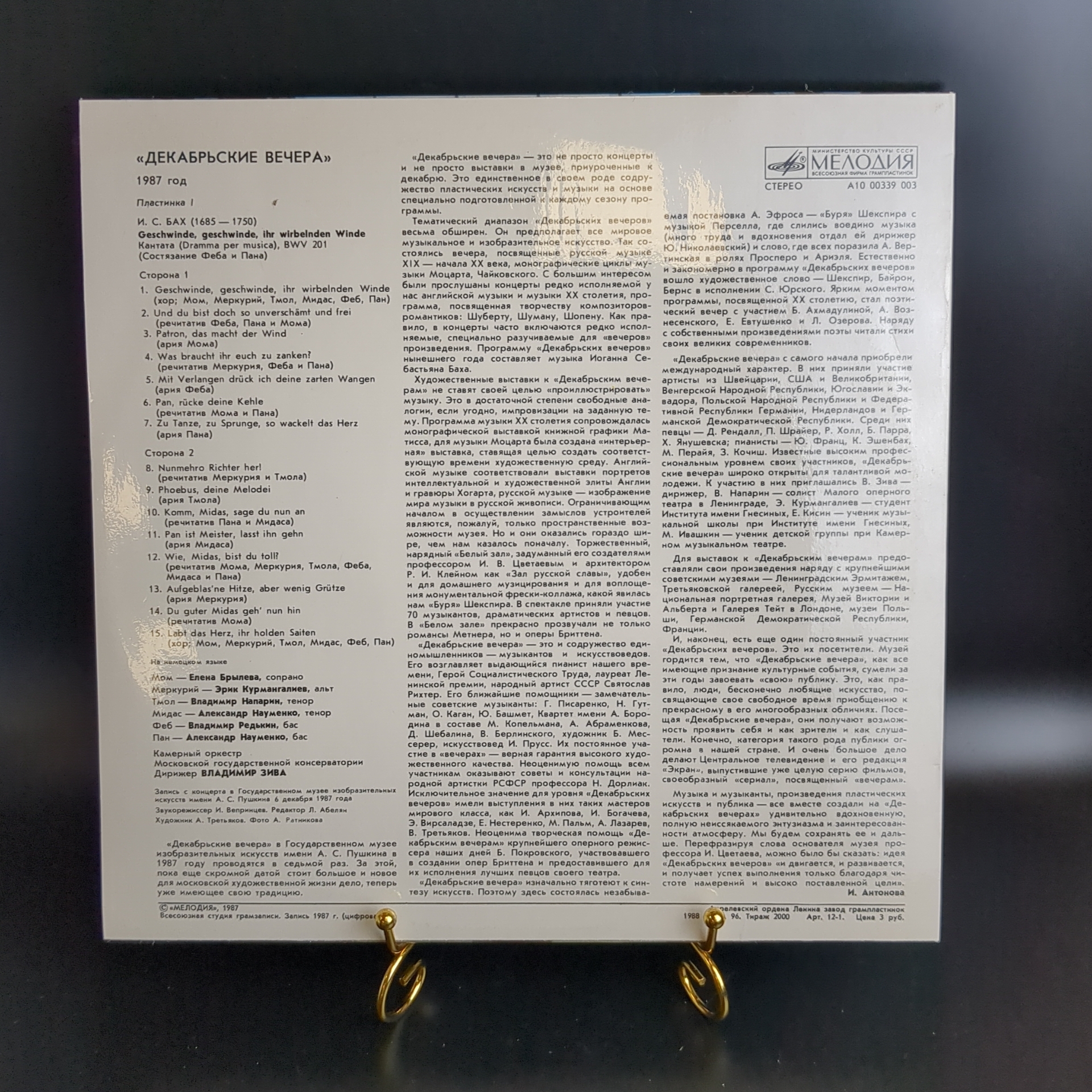 LP И. С. Бах. Декабрьские вечера. Пластинка №1. Концерты в государственном музее изобразительных искусств им. А.С. Пушкина. 1987г. Виниловая пластинка 12 дюймов. Мелодия СССР 1987 год.