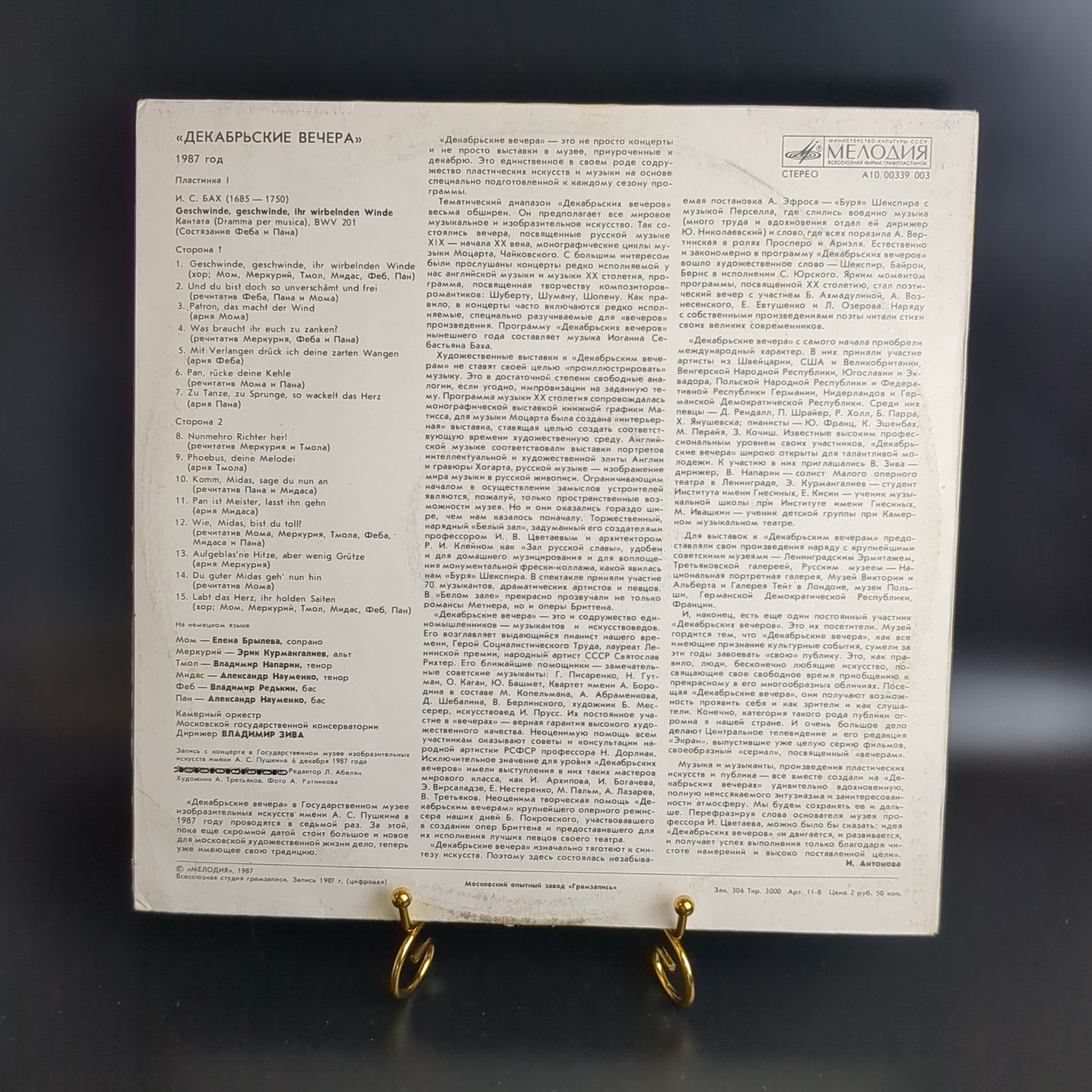LP И. С. Бах - "Декабрьские вечера". Виниловая пластинка 12 дюймов. Мелодия СССР 1987 год. Концерты в государственном музее изобразительных искусств им. А.С. Пушкина.Классическая музыка на виниле. Конверт EX-. Диск EX