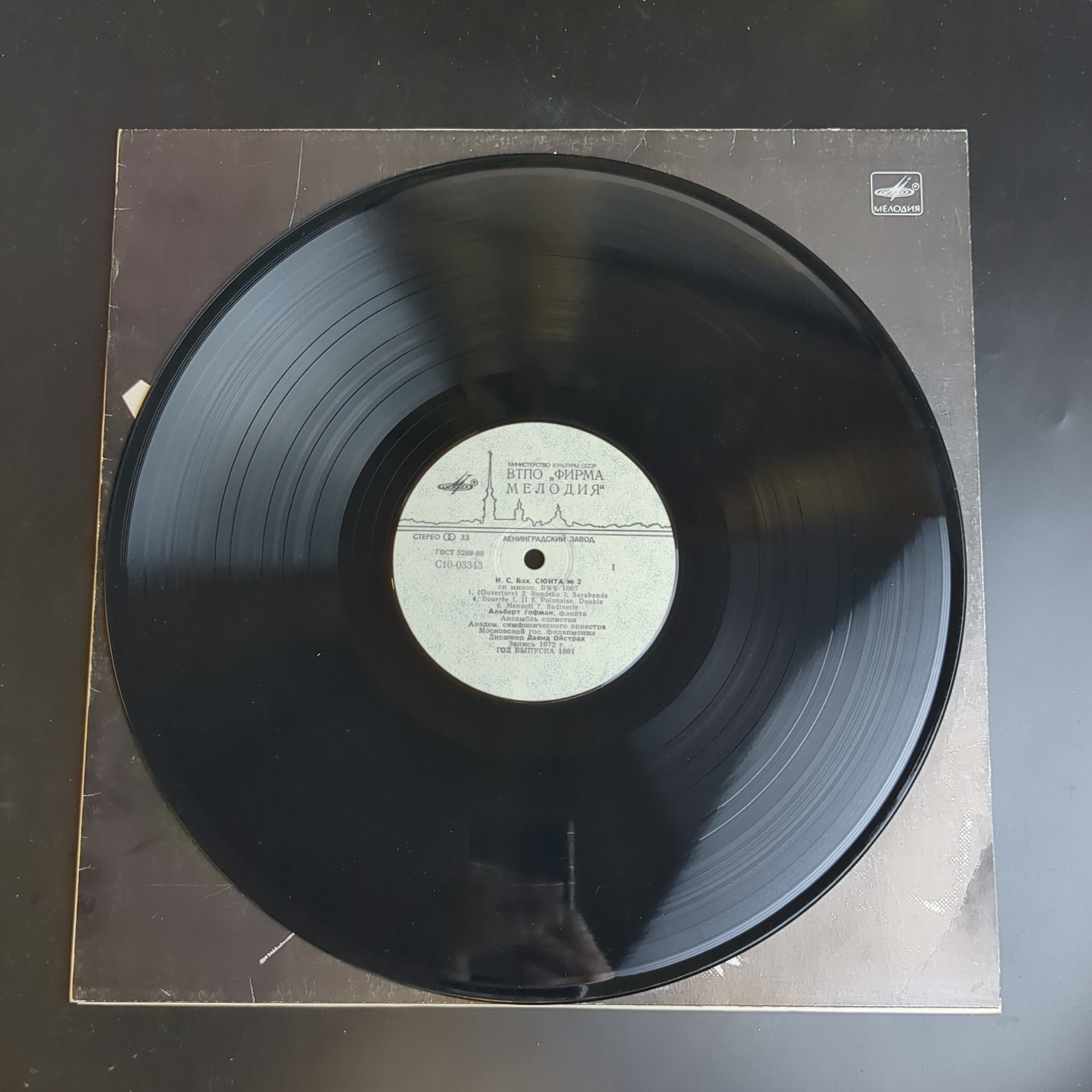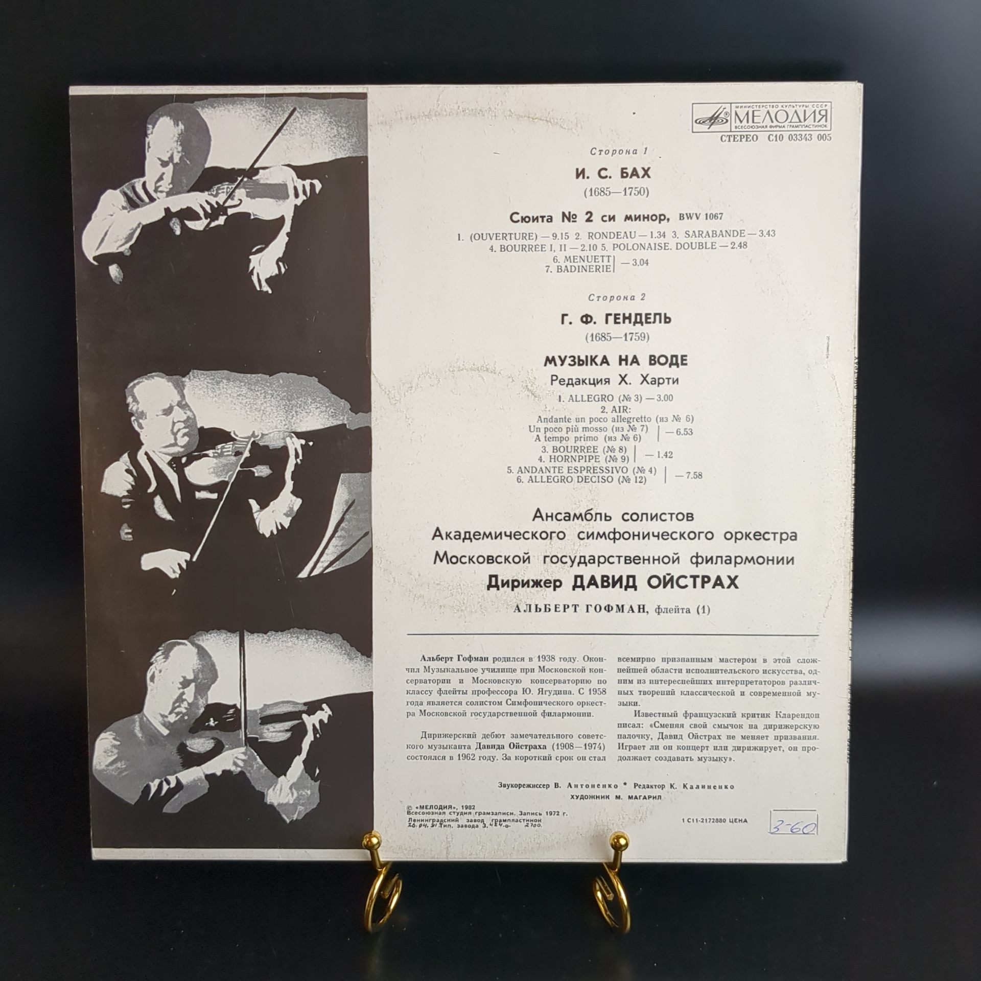 LP И. С. Бах. Сюита №2 си минор. Г. Ф. Гендель. Музыка на воде. Ансамбль солистов Академического симфонического оркестра Московской государственной филармонии. Дирижер Давид Ойстрах. Альберт Гофман, флейта. Виниловая пластинка 12 дюймов. Мелодия СССР 1982 год. Классическая музыка на виниле. Конверт VG+. Диск EX