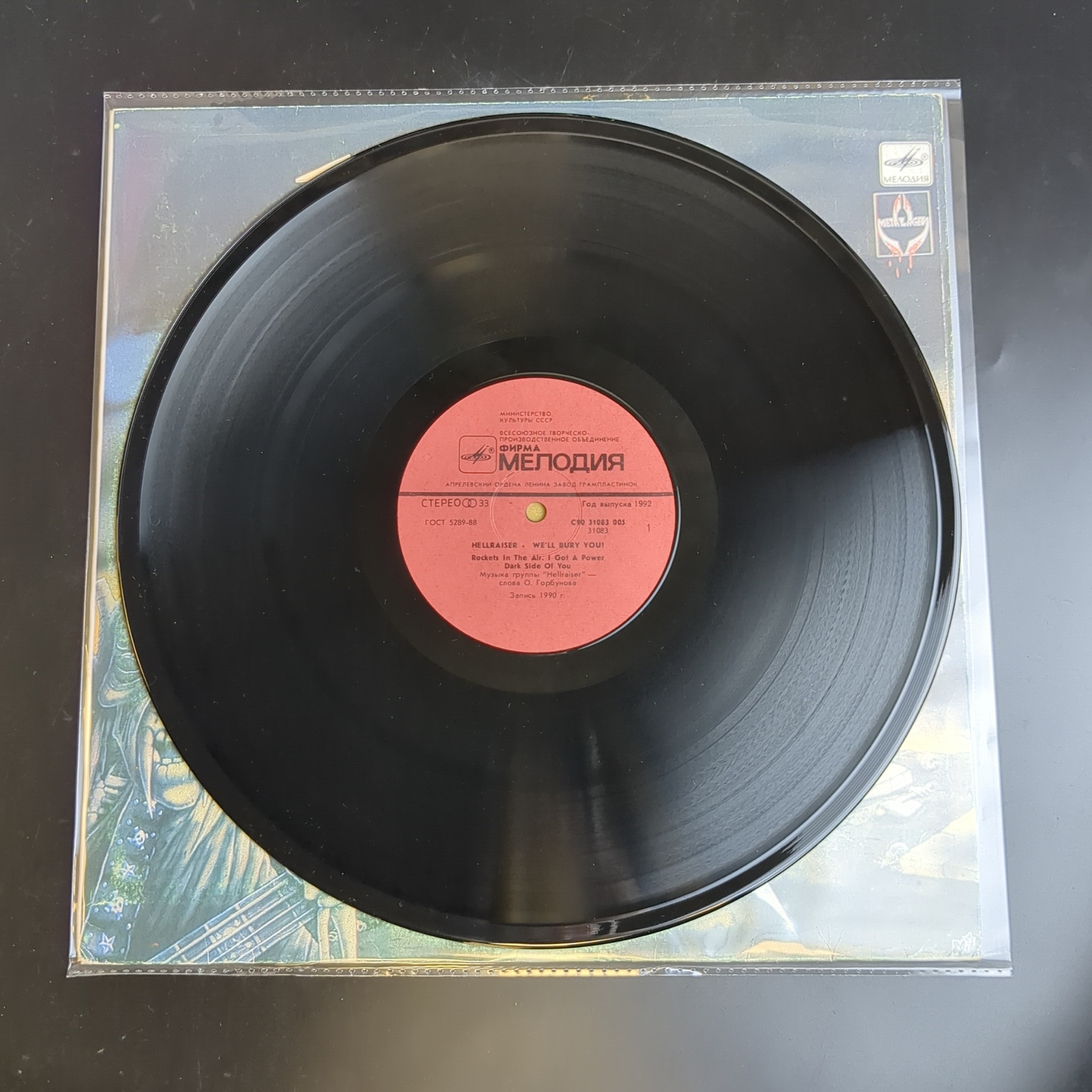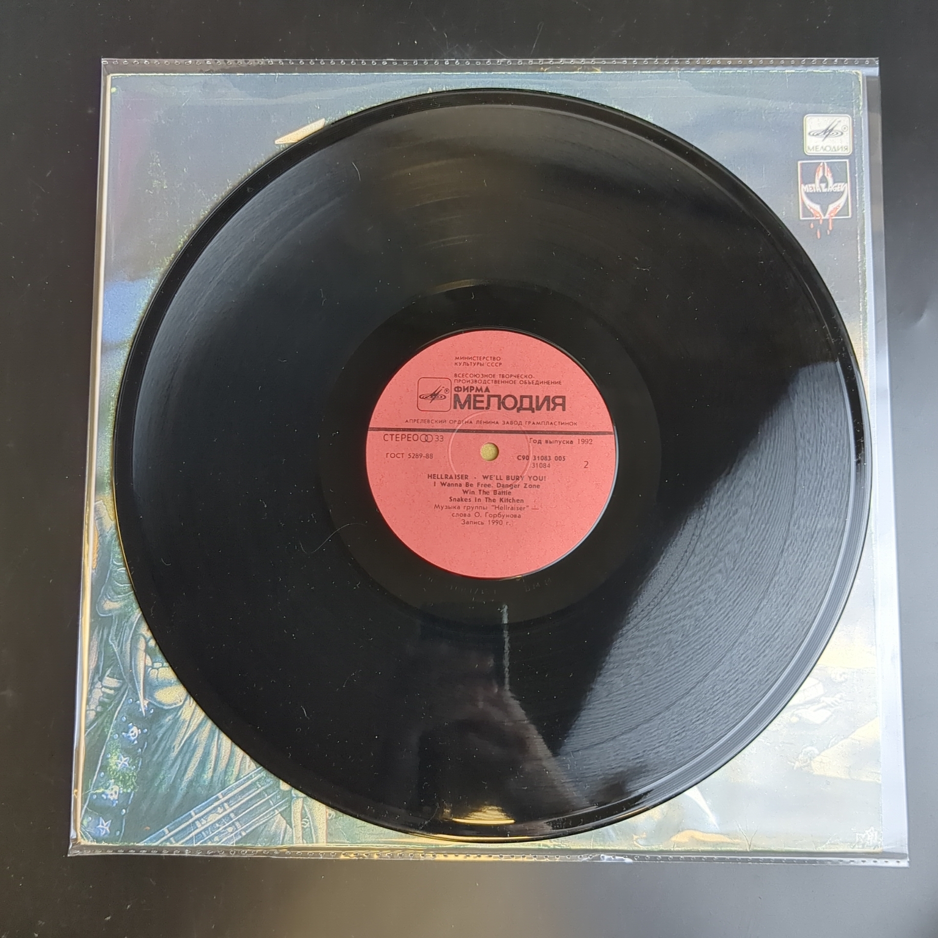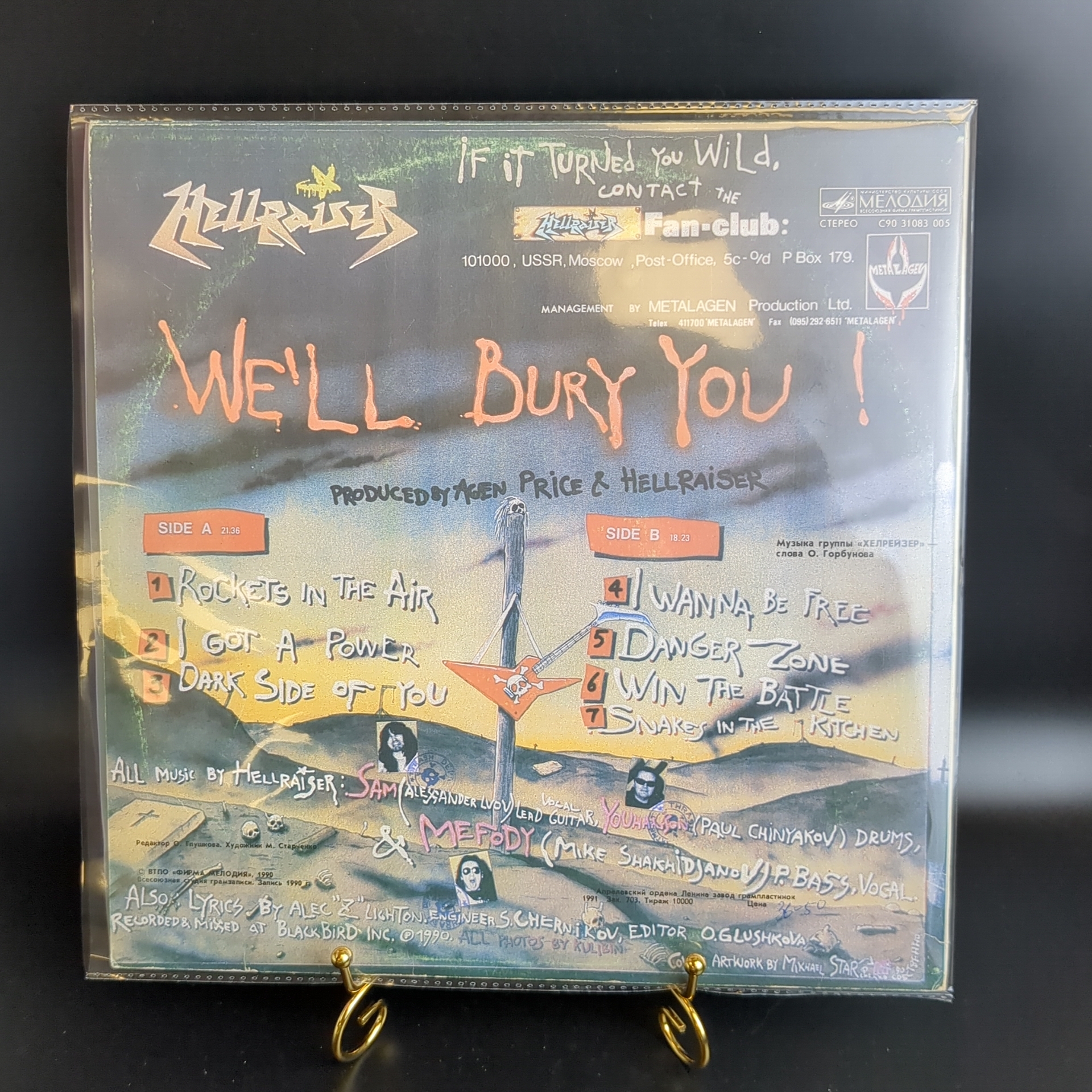 LP Hellraizer - We'll Bury You. Рок. Виниловая пластинка 12 дюймов. 1990 год. " Сторона 1: A1 Rockets In The Air A2 I Got A Power A3 Dark Side Of You Сторона 2: B1 I Wanna Be Free B2 Danger Zone B3 Win The Battle B4 Snakes In The Kitchen" . Конверт EX / Диск EX