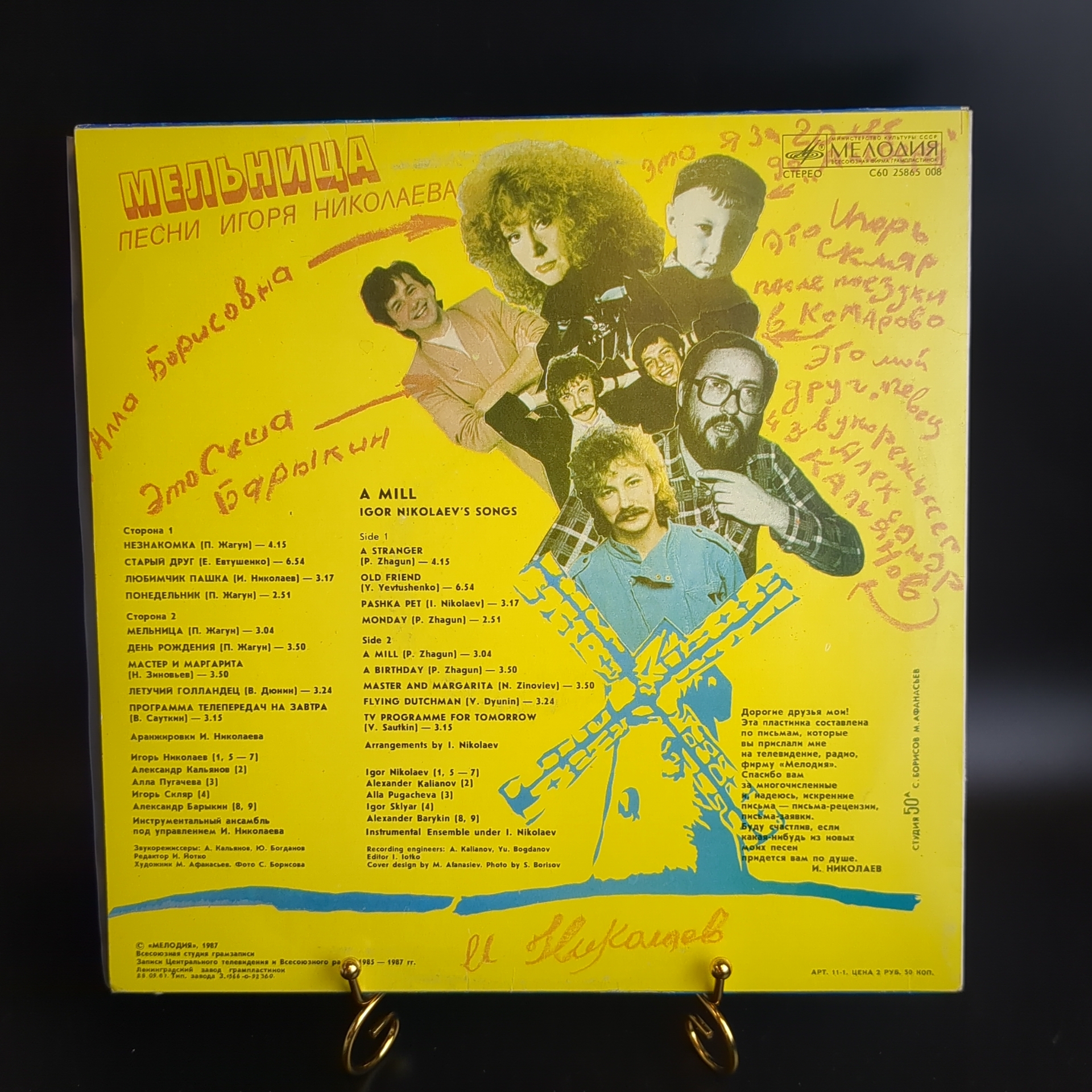 LP Мельница - песни Игоря Николаева (незнакомка/ старый друг/ любимчик пашка/ понедельник и др), Виниловая пластинка 12 дюймов. Мелодия СССР. 1987 год. Конверт EX / Диск EX
