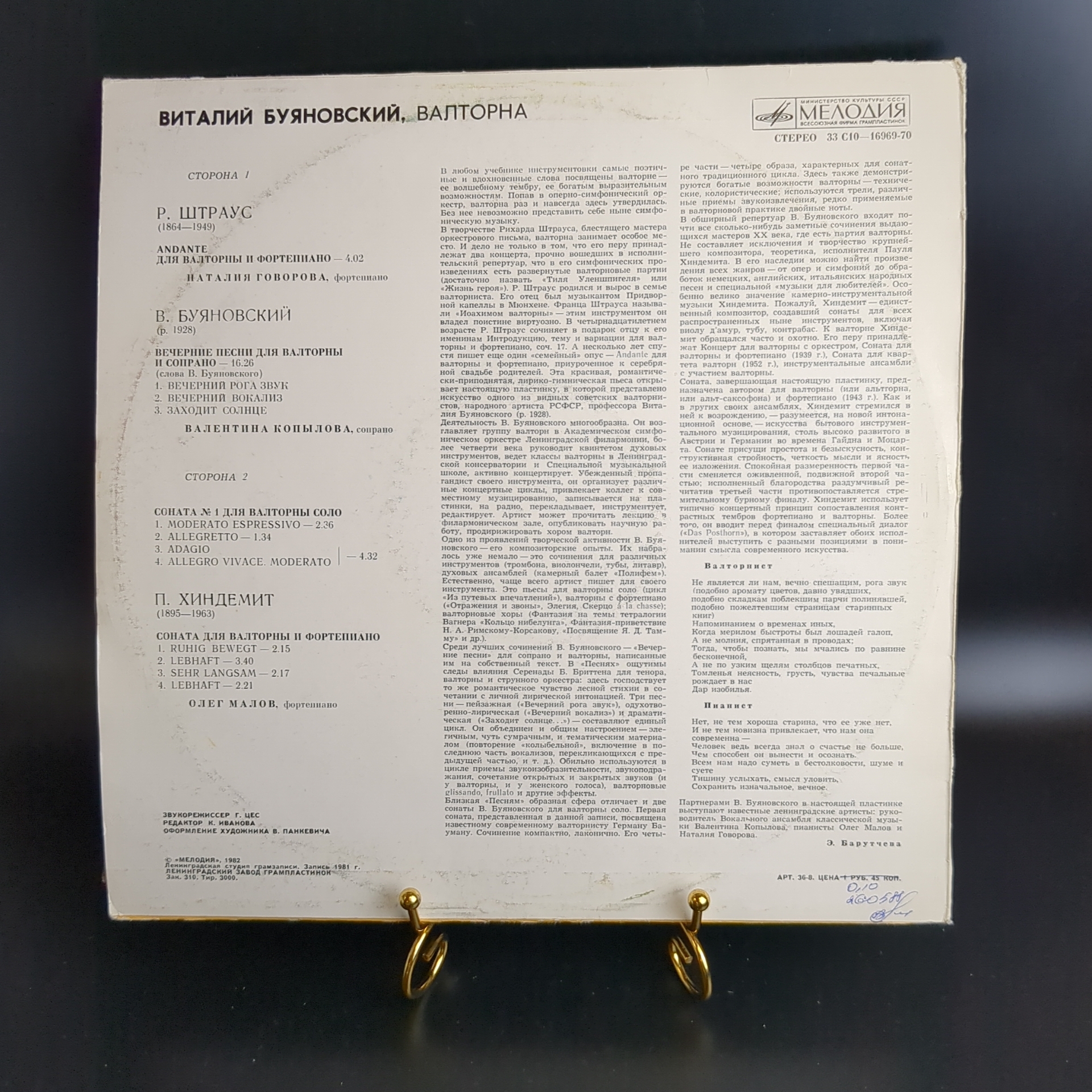 LP Р. Штраус. В. Буяновский. П. Хиндемит. Музыка для валторны. Виталий Буяновский, валторна. Виниловая пластинка 12 дюймов. Мелодия СССР 1982 год.