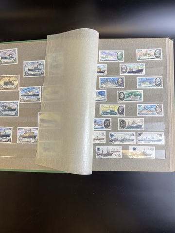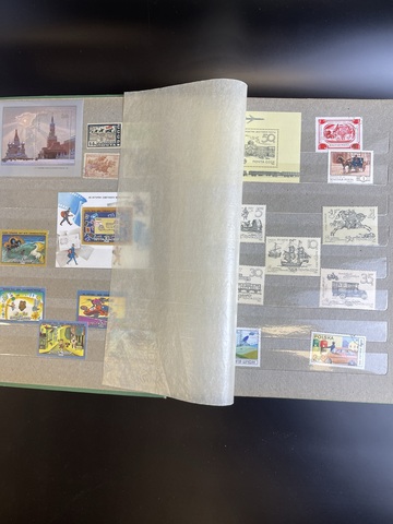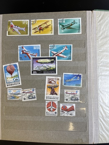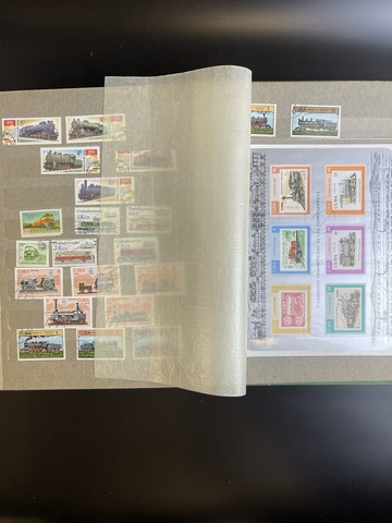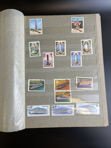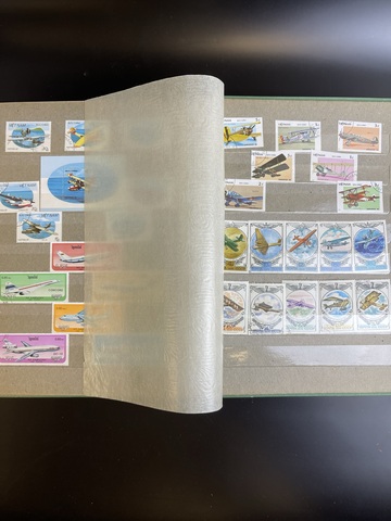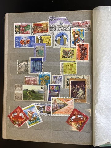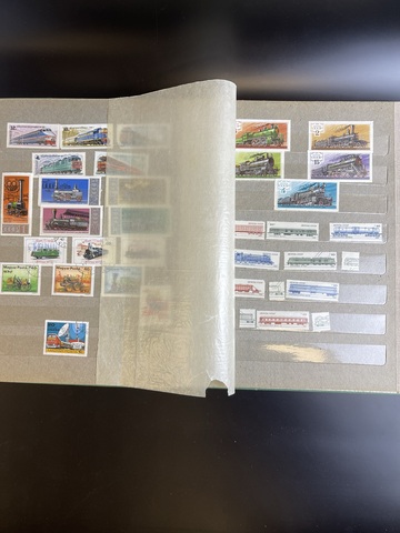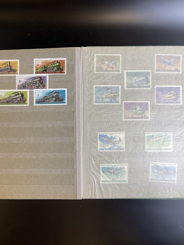 Марки в большом альбоме больше 200 штук, размер 30 на 21.5 см на разные тематики : корабли, мультфильмы, лошади, автомобили, паровозы, самолеты, вертолеты. Марки СССР, Монголии, Кубы, Вьетнама, Чехословакии. Есть еще свободные страницы для добавления марок