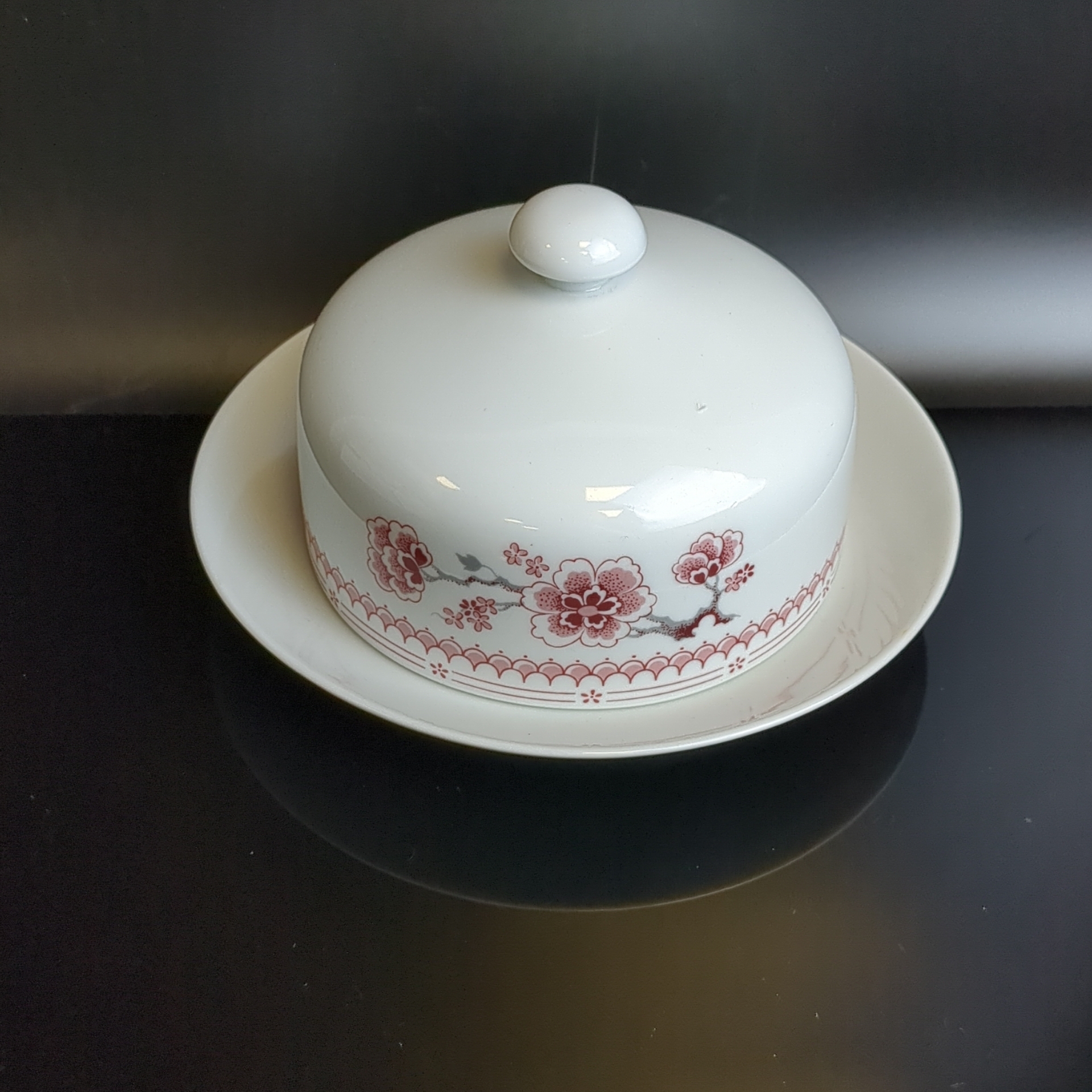 Маслёнка фарфоровая с крышкой, цветочный декор, винтаж времён СССР 1970-1990 гг. Состояние на фото
