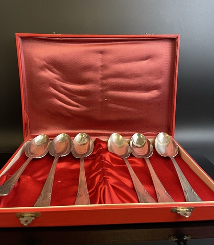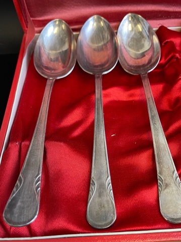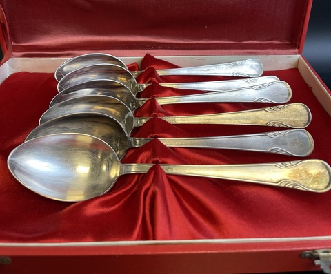 6 мельхиоровых Столовых ложек в футляре . Клеймо ЮММЕТ. СССР. Присутствуют следы использования. Состояние на фото