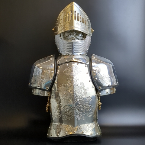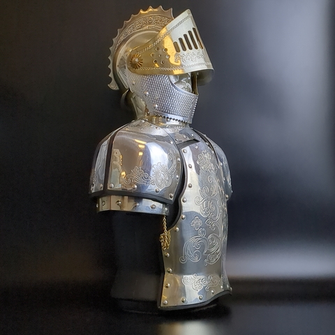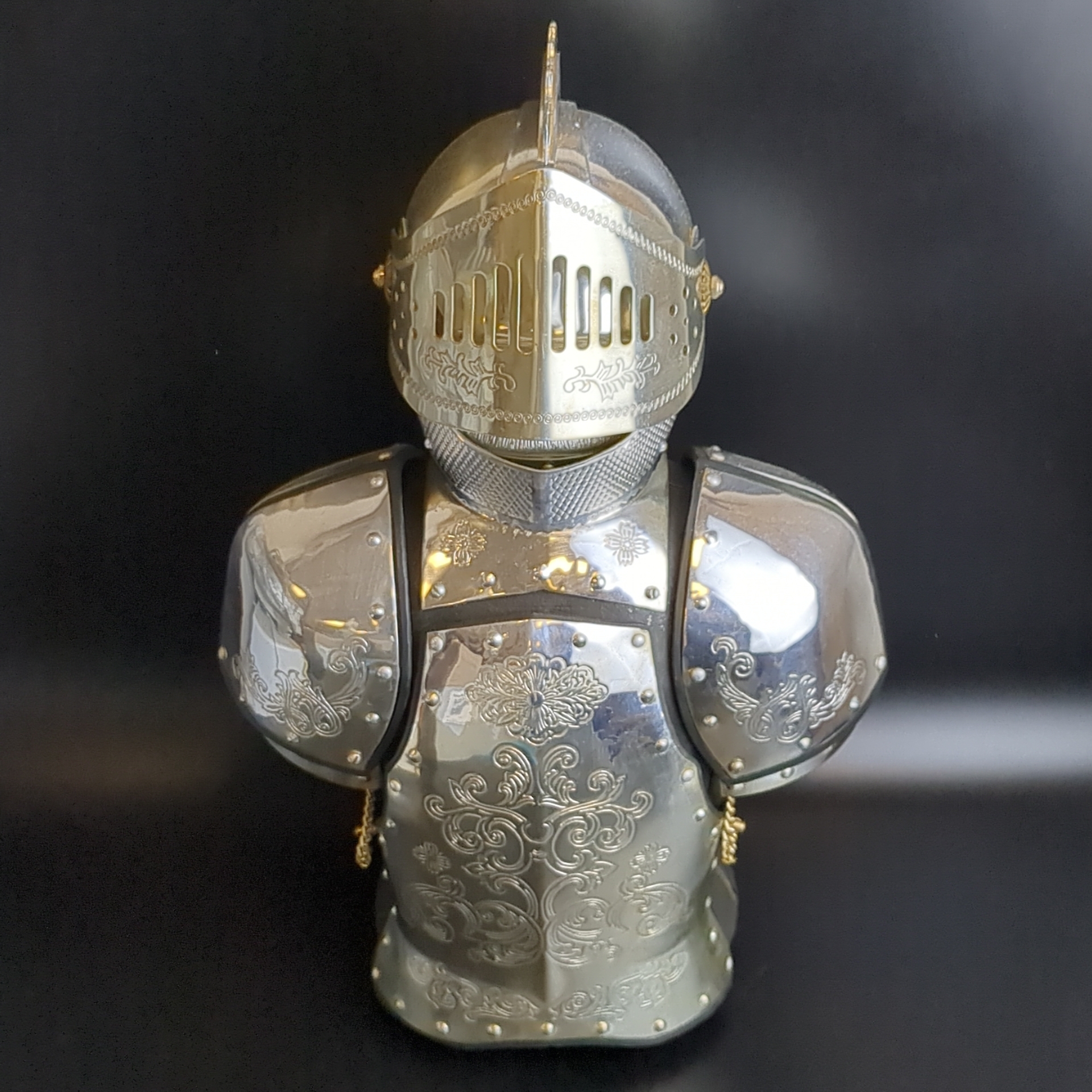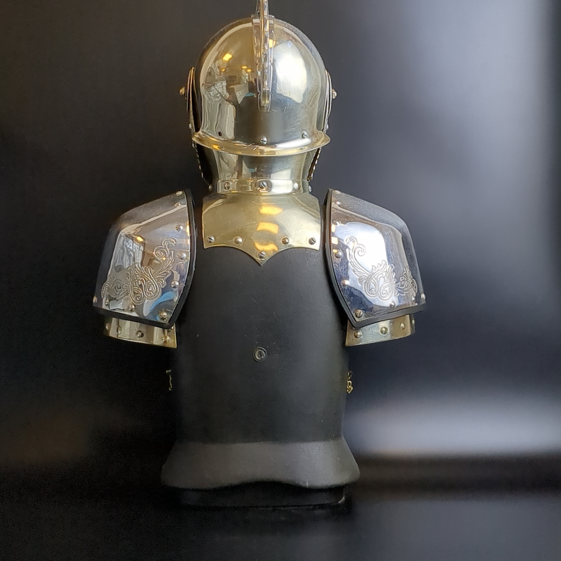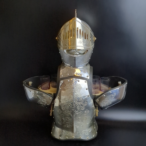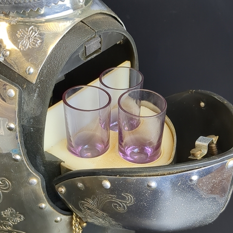Мини - бар Средневековый Рыцарь. Графин, 5 рюмок. Интерьерный. Металл. Винтаж СССР. В грудном отсеке находится штоф-графин, в плечах стопки 5 штук лилового оттенка цветное стекло. Высота 40 см. Идеально для интерьера и уютного застоля. Следы использования, состояние на фото