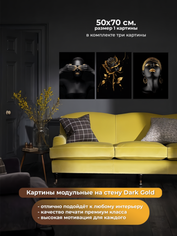 Модульная картина «Dark Gold» состоит из трех отдельных картин размером 50 см x 70 см каждая. Общий размер модульной картины 50 см x 210 см