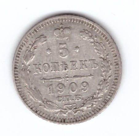 В центре указан номинал «5», ограниченный с обеих сторон звездочками. Над цифрой – Корона Российской империи. Под цифрой номинала — слово "КОПЕЕК". Ниже, расположен декоративный разделитель в виде двух разнонаправленных фигурных линий и стилизованным из точек крестом между ними. Под разделителем — дата выпуска монеты «1909». Под цифрой даты — обозначение монетного двора «С.П.Б.». Вдоль канта, не доходя до короны, изображен венок из лавровой и дубовой ветви, которые в нижней части перевязаны лентой на узел бантом. По окружности канта имеются рельефные элементы, выполненные в виде зубцов.