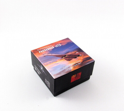 На реверсе каждой монеты изображён один из двух известных сверхзвуковых пассажирских самолётов: советский «Ту-144» и англо-французский «Конкорд». Самолёты изображены каждый в двух ракурсах: в центральной части реверса - спереди; в верхней части, выполненной в цвете, - в полёте, на фоне неба и фрагмента государственного флага (флагов). Внизу имеется надпись «MACH» и число в виде значения приборного счётчика, отражающие для представленных моделей сверхзвуковых самолётов их главную характеристику - число Маха (отношение скорости полёта к скорости звука).